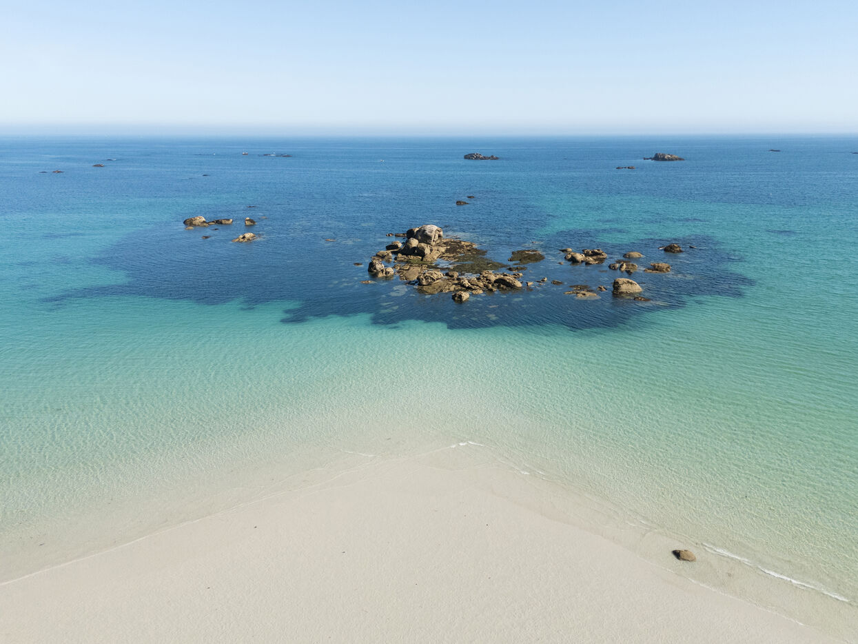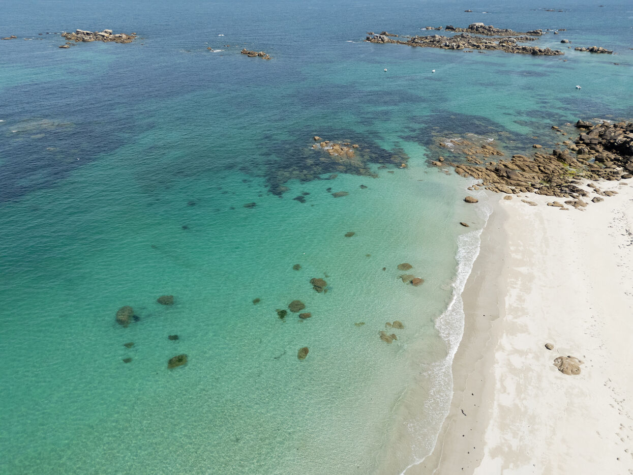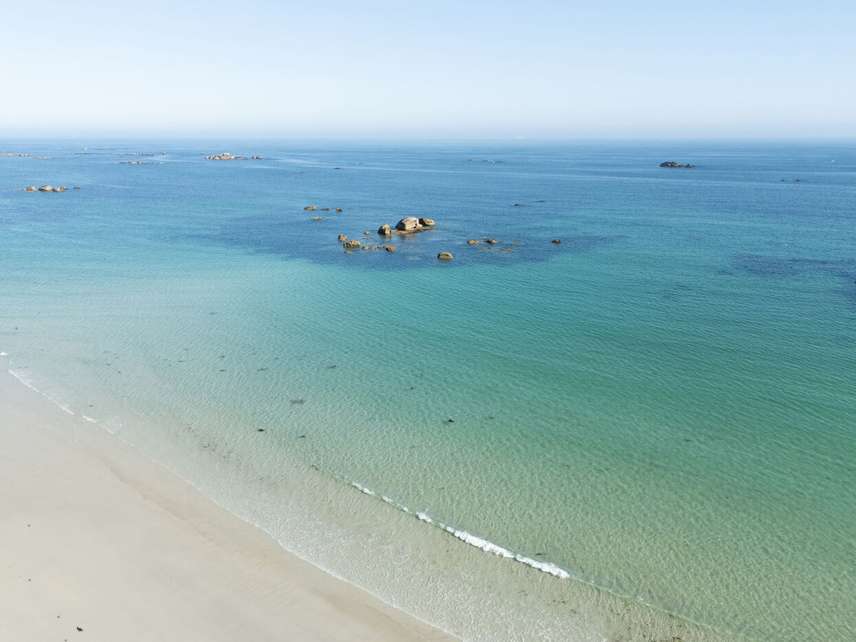 Fine sand, deserted beaches dotted with rocks whose shapes stimulate the imagination, turquoise water that changes with the light. Kerlouan's picture-postcard scenery invites you to contemplate and get away from it all. Flying over the Breton Caribbean at Kerlouan.
