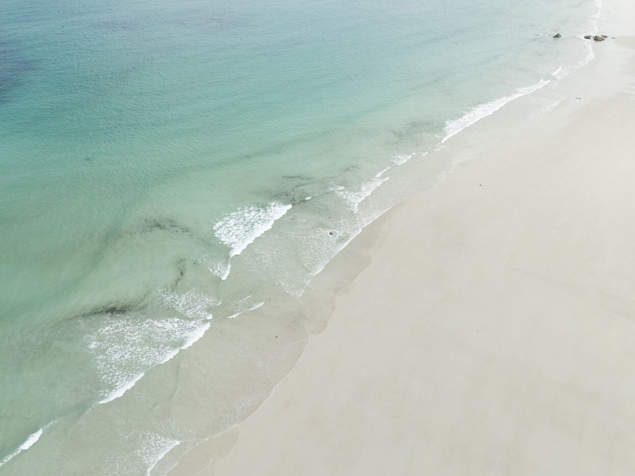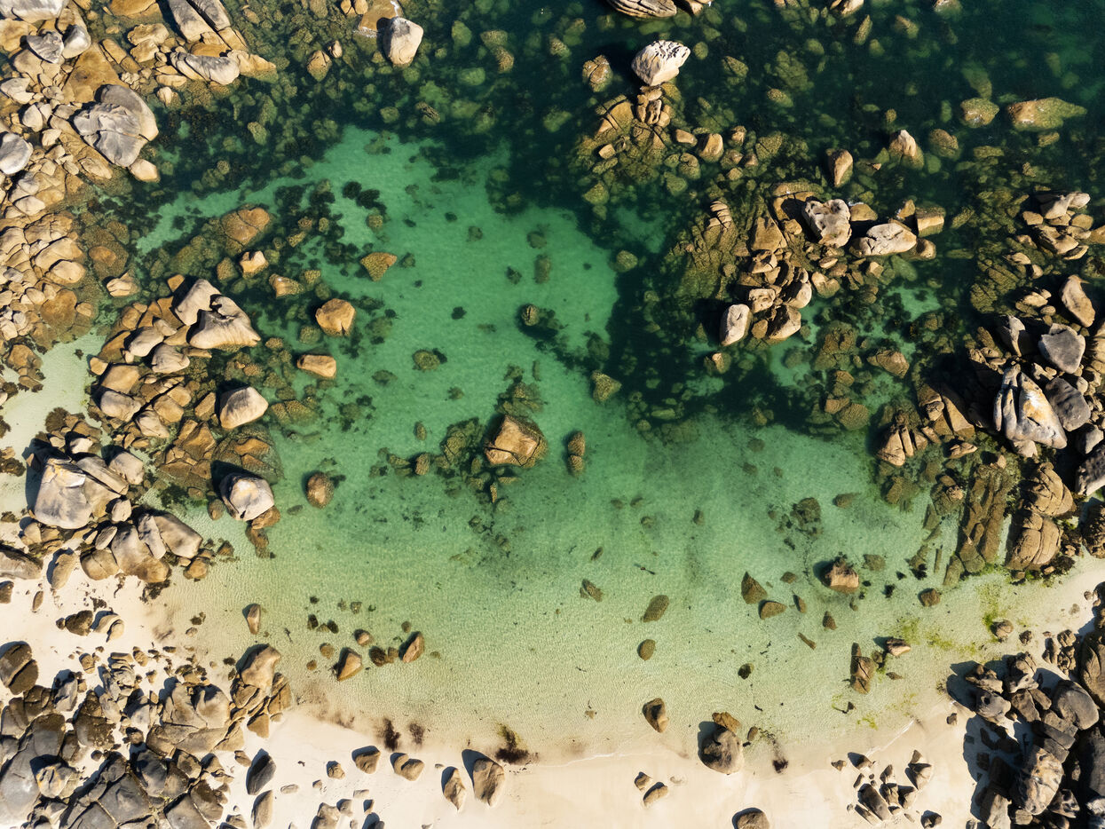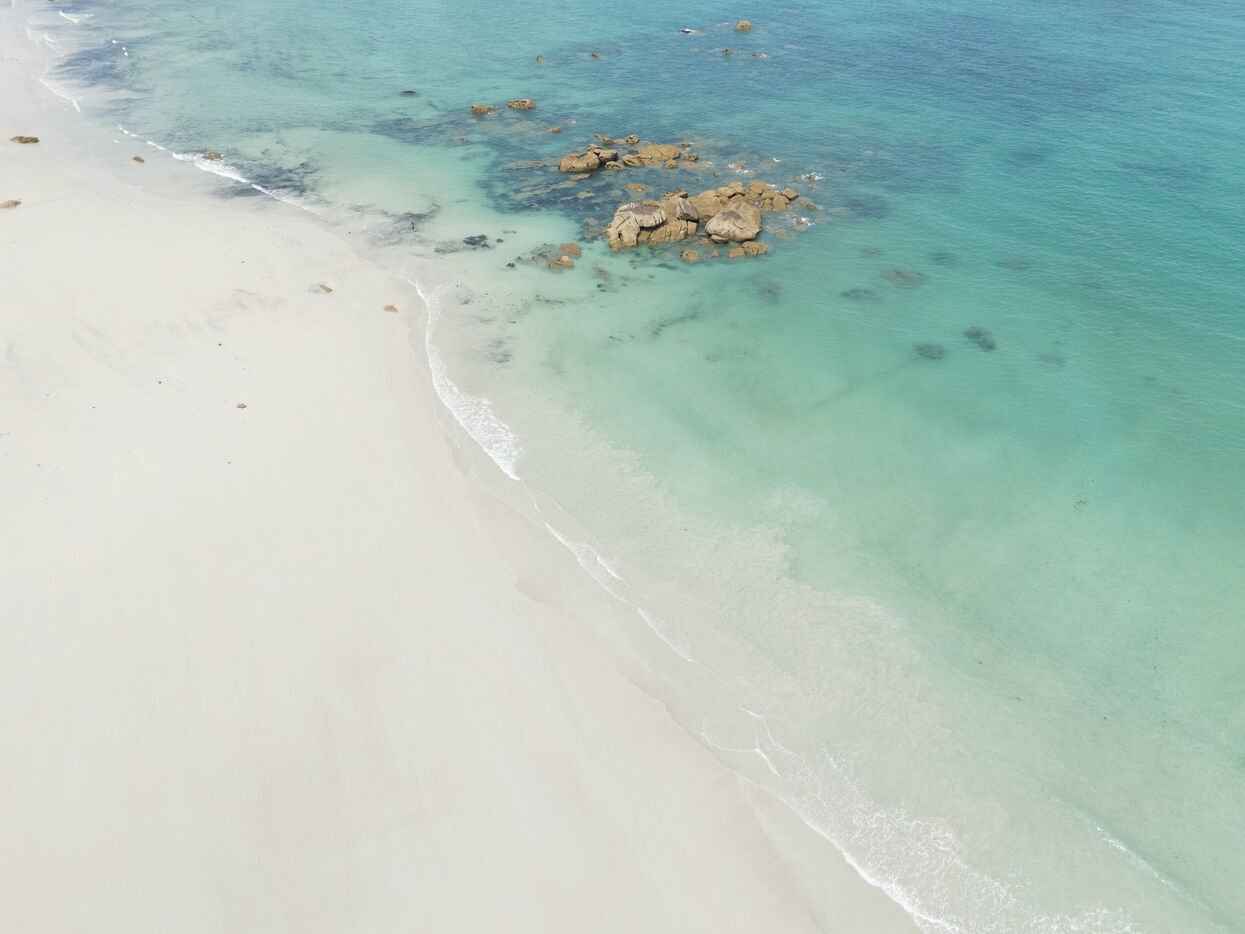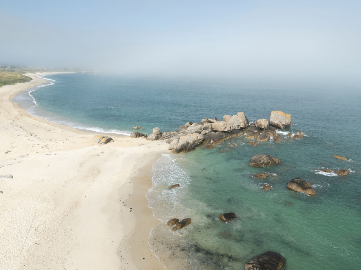Fine sand, deserted beaches dotted with rocks whose shapes stimulate the imagination, turquoise water that changes with the light. Kerlouan's picture-postcard scenery invites you to contemplate and get away from it all. Flying over the Breton Caribbean at Kerlouan.