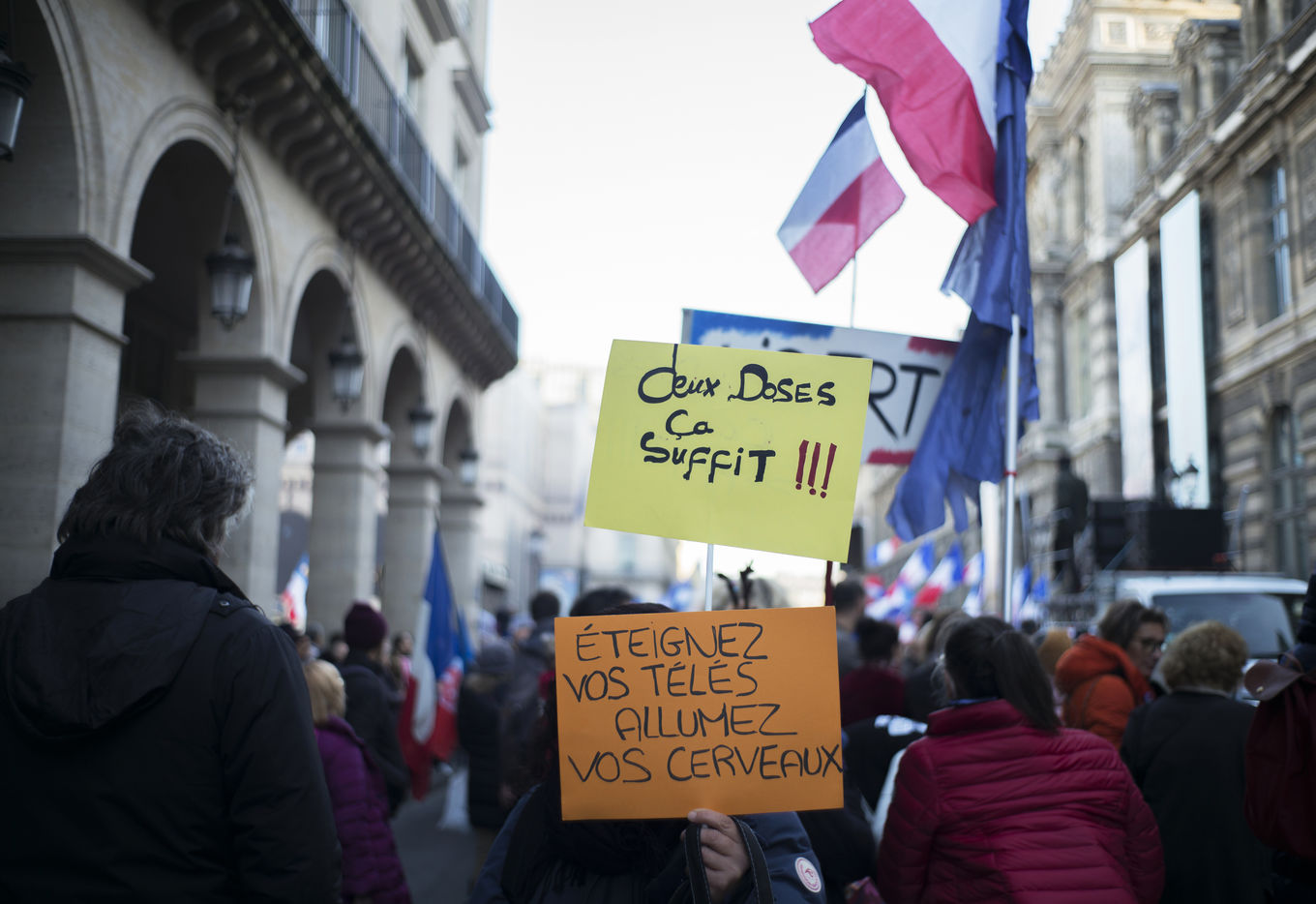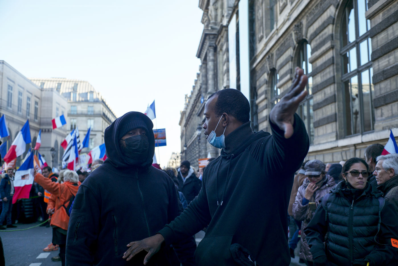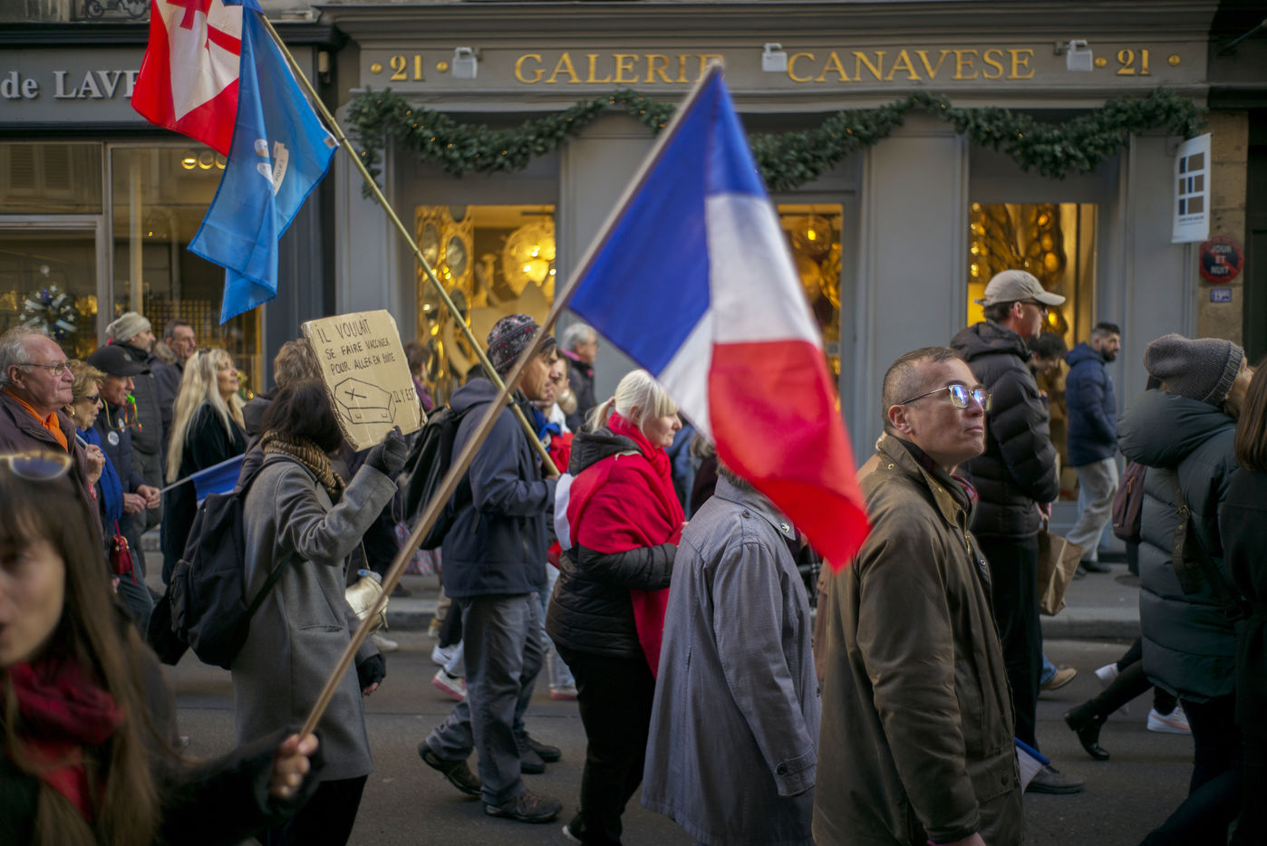 Quelques milliers d'opposants d'extrême droite ont manifesté samedi 18 decembre 2021, à Paris, contre le futur pass vaccinal et la troisième dose de vaccin obligatoire pour les soignants et les pompiers, à partir du 30 janvier 2022.
