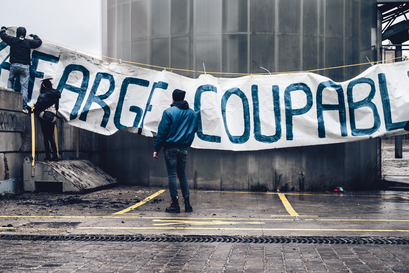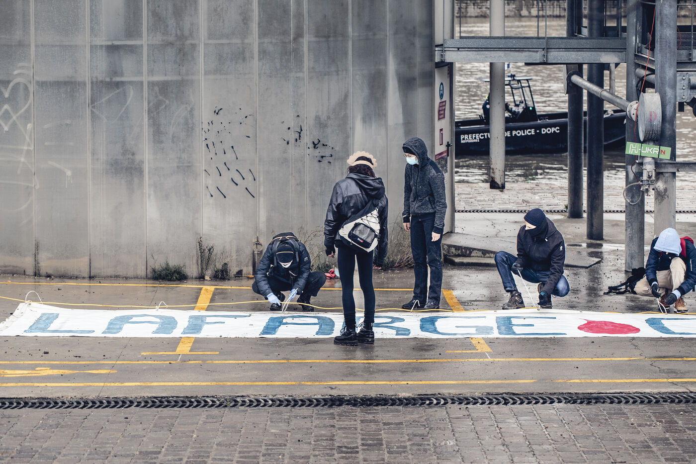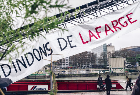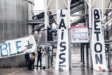 The environmental collective Les Soulèvements de la Terre has organised days of action in several French towns against the production sites of cement manufacturer Lafarge-Holcim, accused of artificialising land and polluting the environment through its cement works and concrete plants. Paris, 11 December 2023.