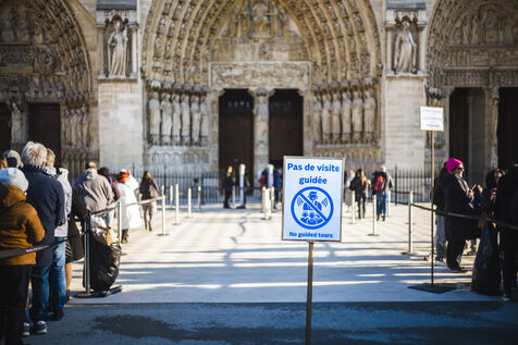 Devant la cathédrale, accessible au public depuis le 7 décembre dernier après plus de cinq de travaux, des visiteurs se pressent pour visiter l'intérieur restauré.