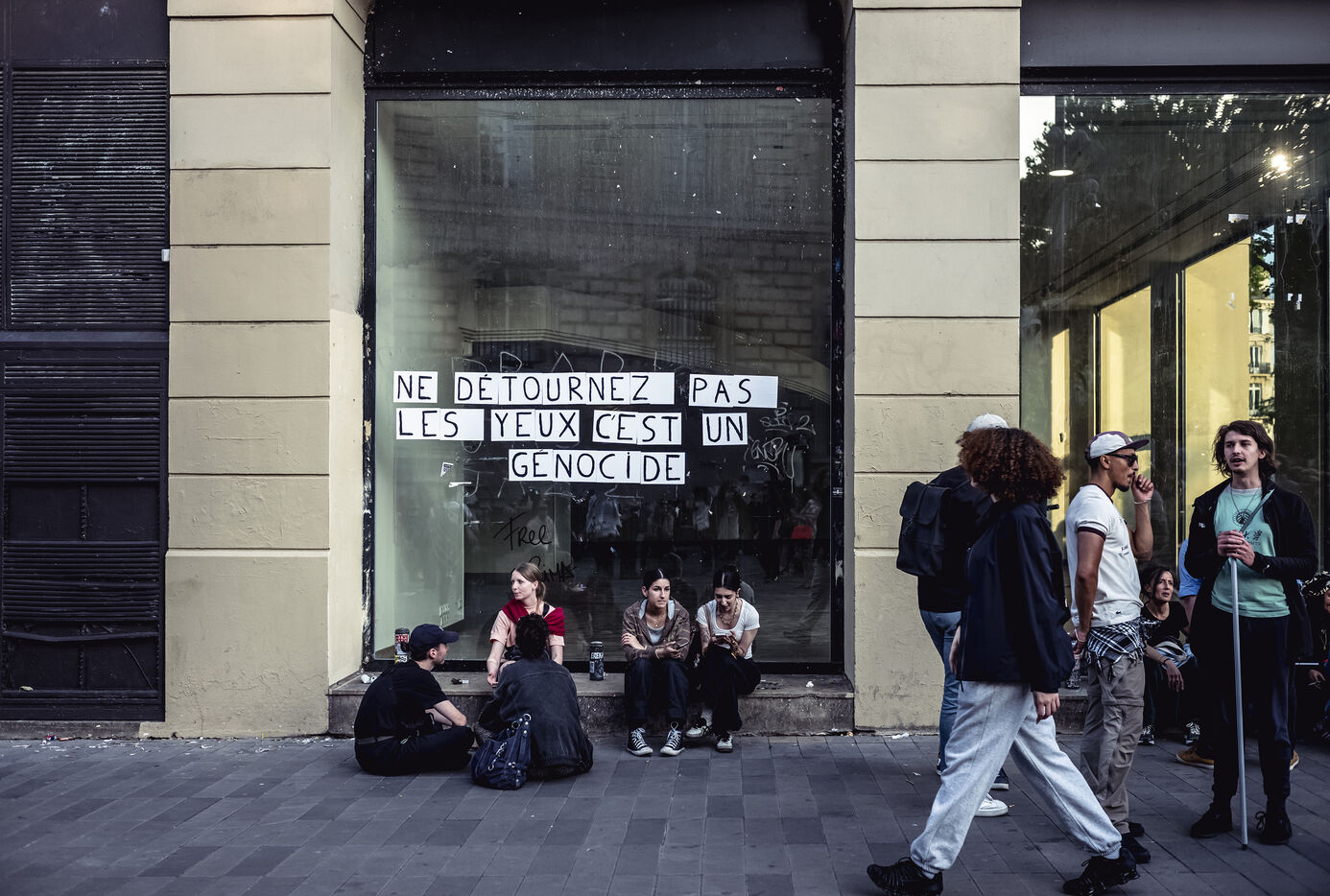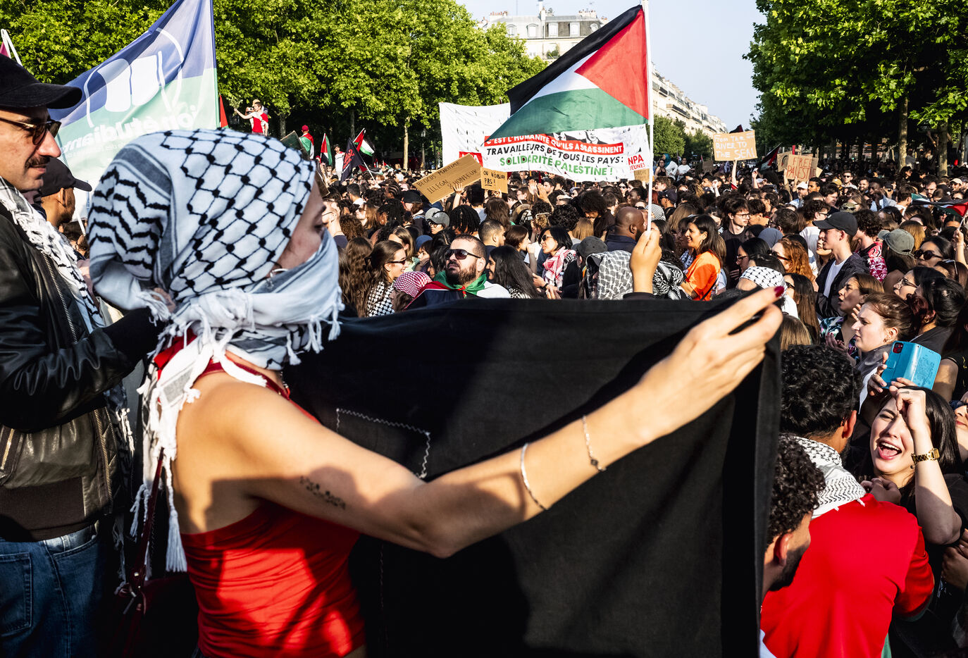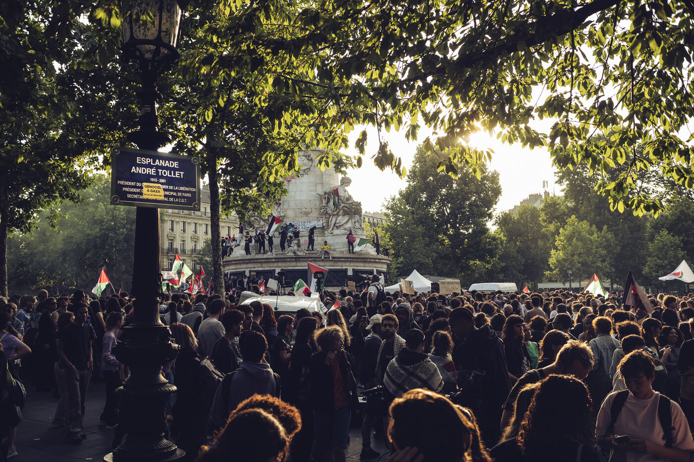 Des manifestants se sont rassemblés place de la République à Paris, les 9 et 10 juin 2025 en soutien à la Palestine, après l’interception par les autorités israéliennes de l'équipage du Madleen de la Flottille de la liberté pour Gaza.