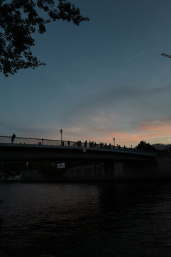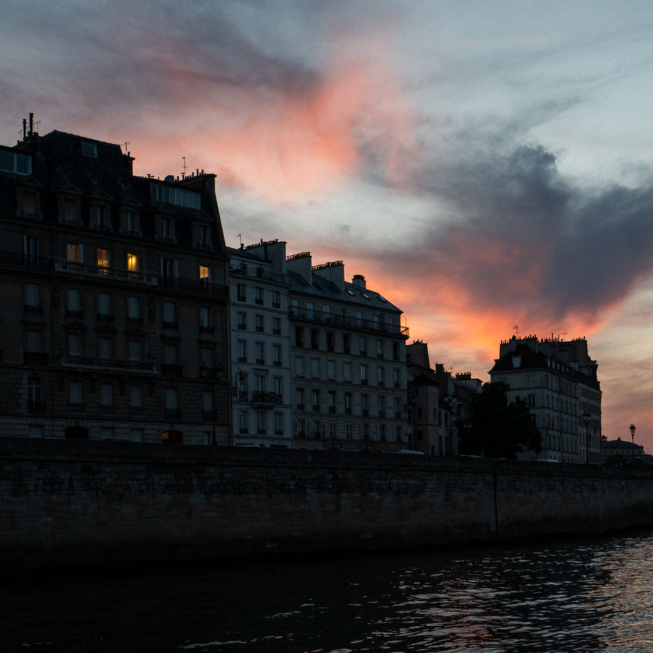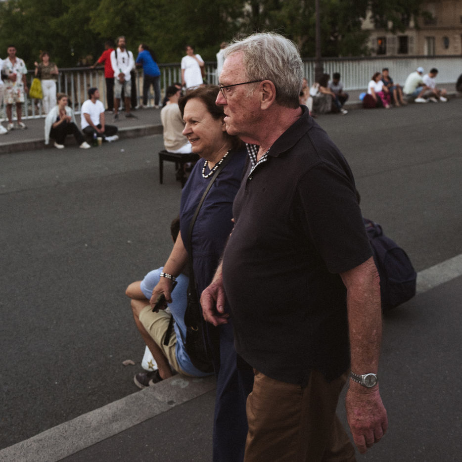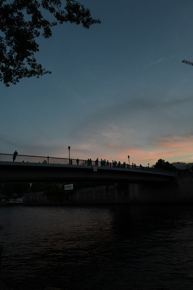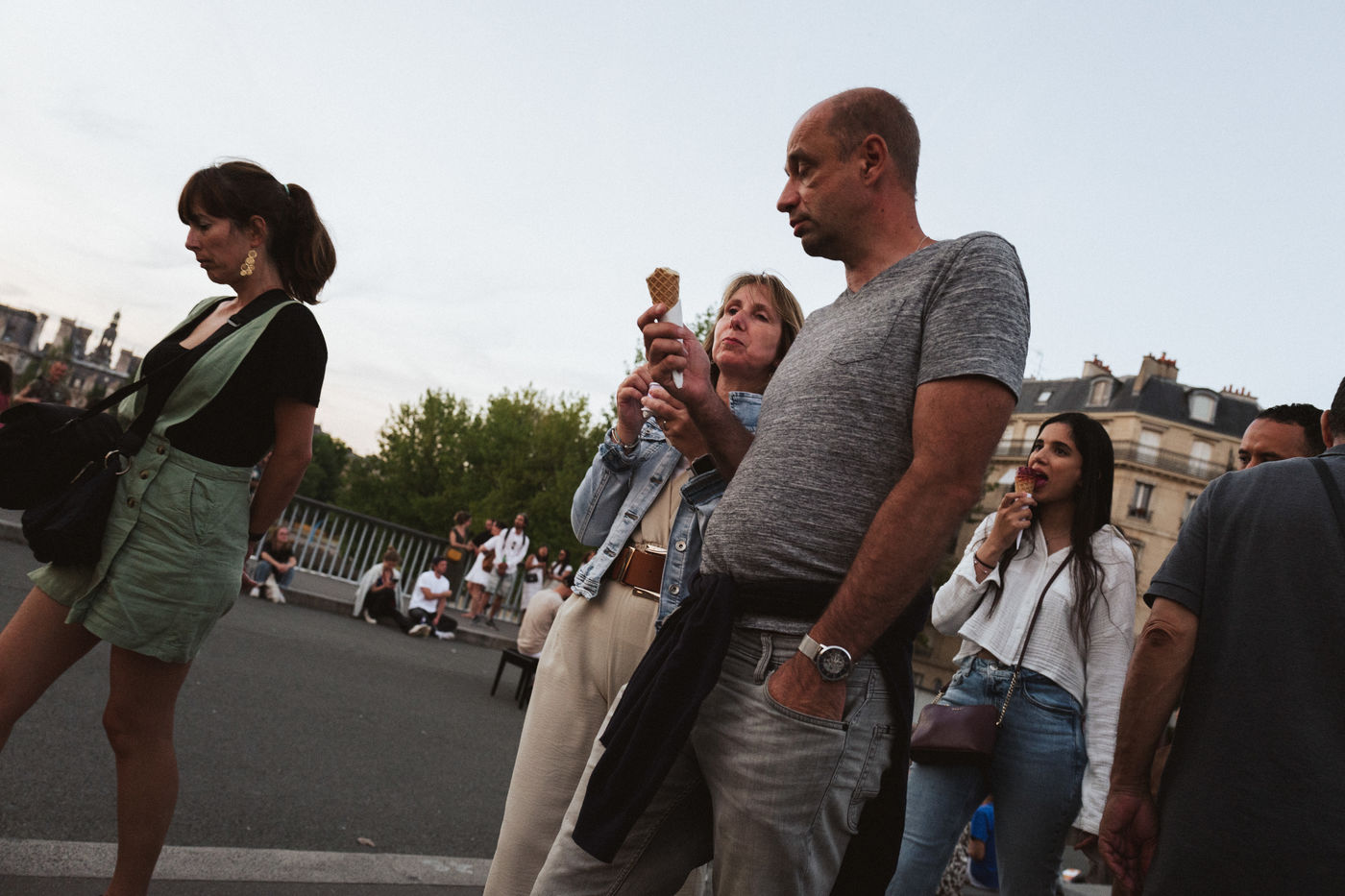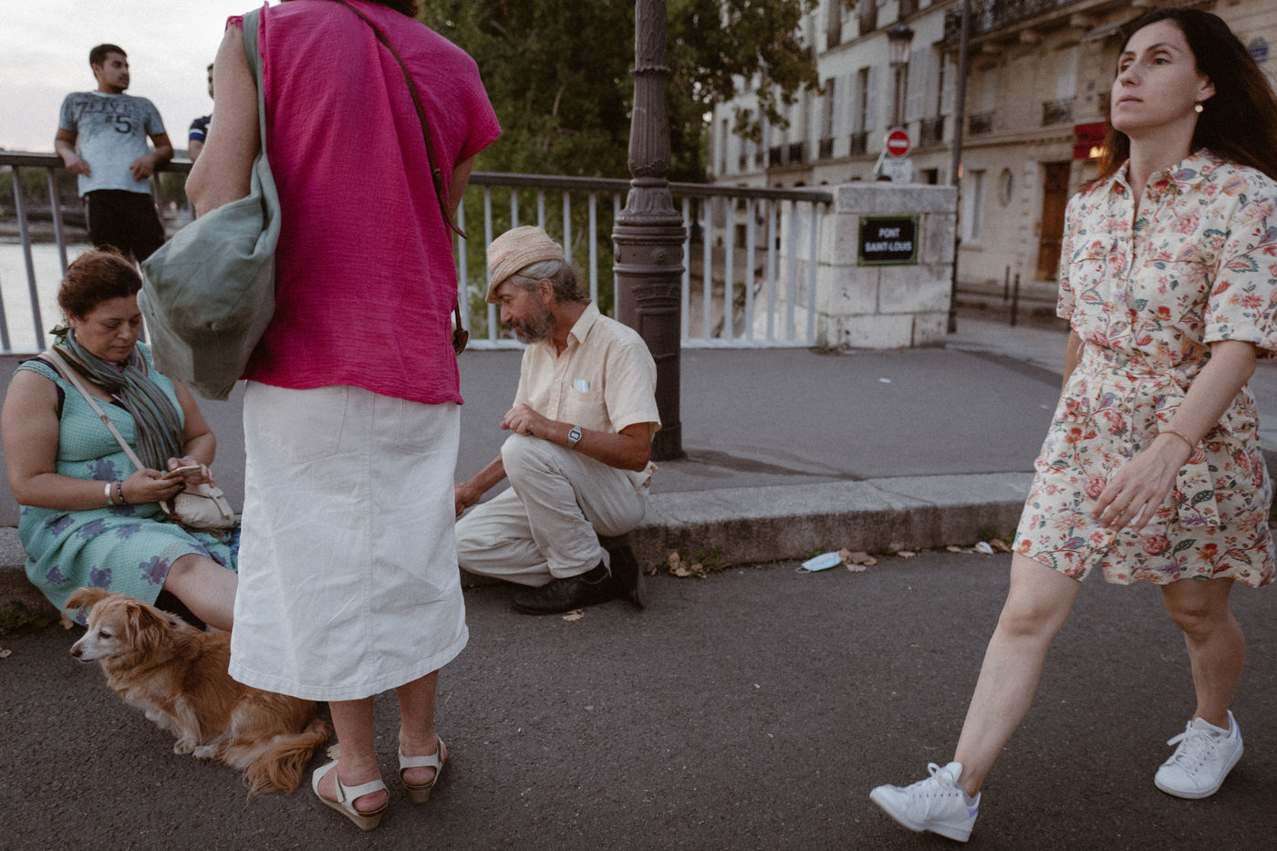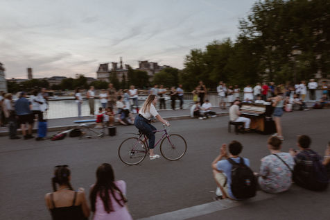 La scène se passe autour d'un homme jouant du piano sur le Pont Saint-Louis à Paris durant l'été 2023. De nombreuses s'arrêtent le temps de regarder le spectacle sous un coucher de soleil magnifique. L'ambiance est typique des soirs d'été parisiens. Une vie sur les quais et les ponts de la Seine.