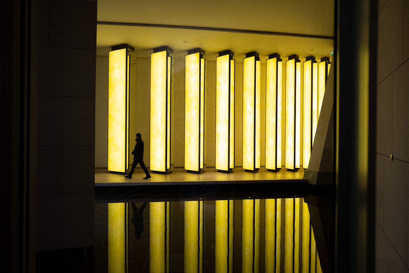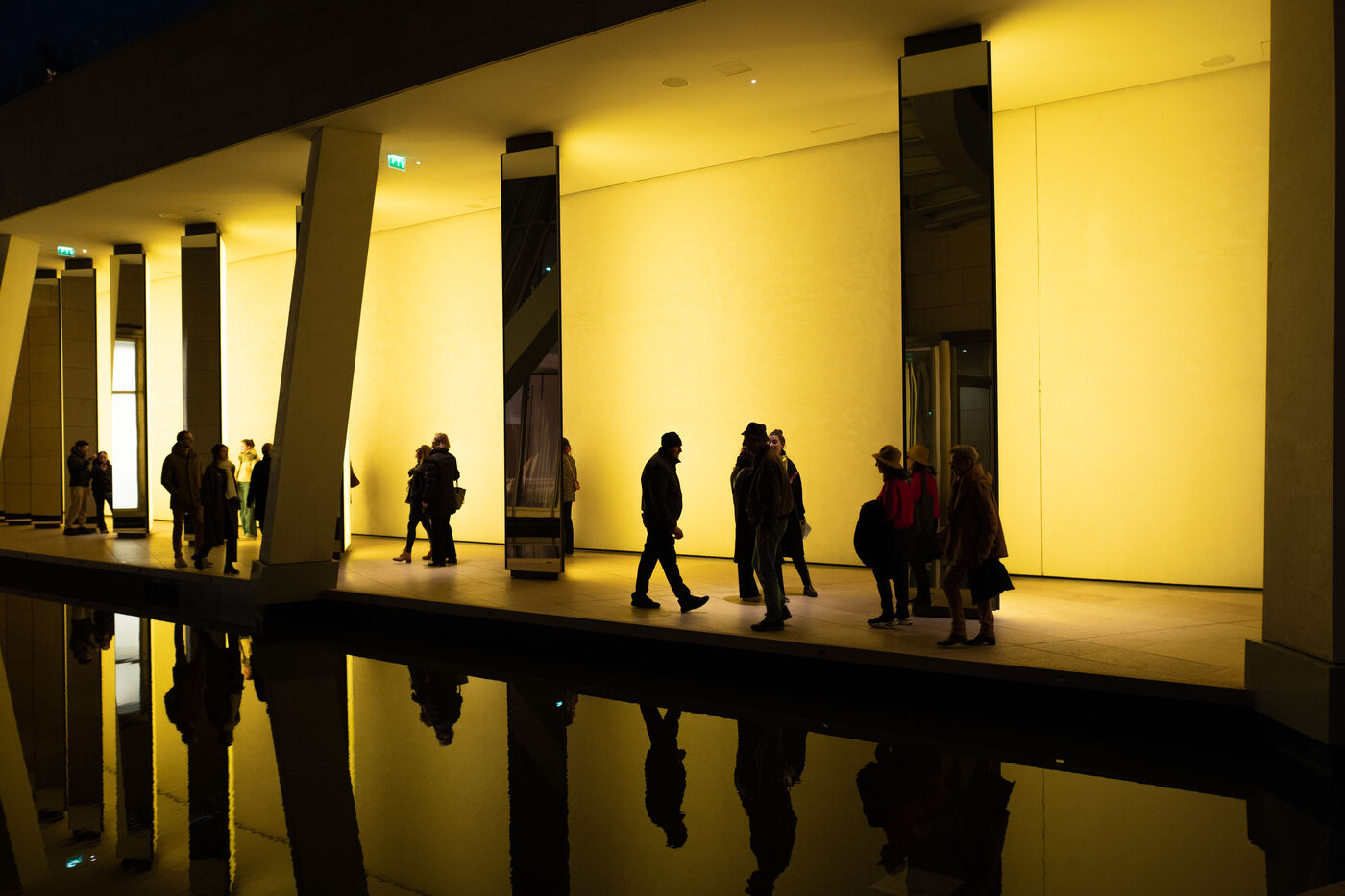 Different views of the Louis Vuitton Foundation in Paris at the end of the day.
