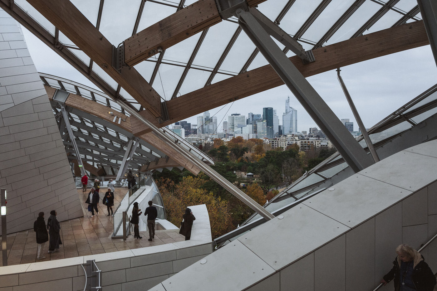 Différentes vues de la fondation Louis Vuitton à Paris en fin de journée.