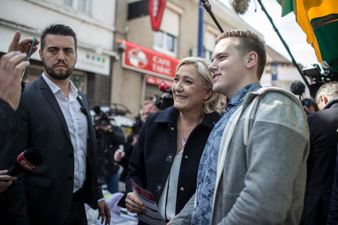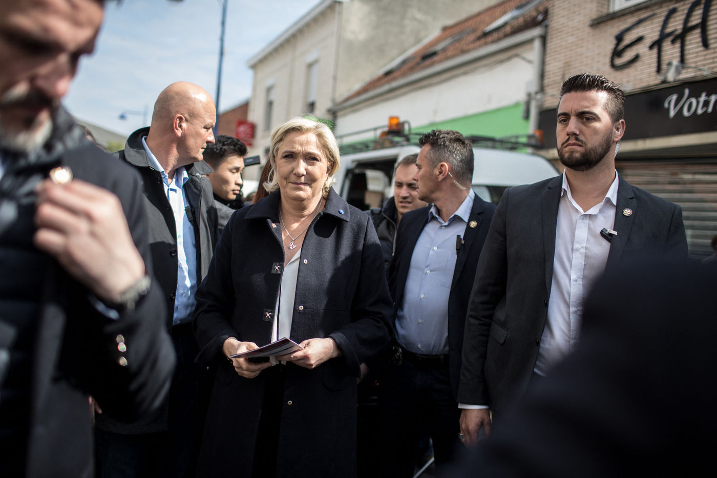1ère sortie de Marine Le Pen au lendemain du 1er tour de l'élection présidentielle sur le marché de Rouvroy dans le Pas-de-Calais.