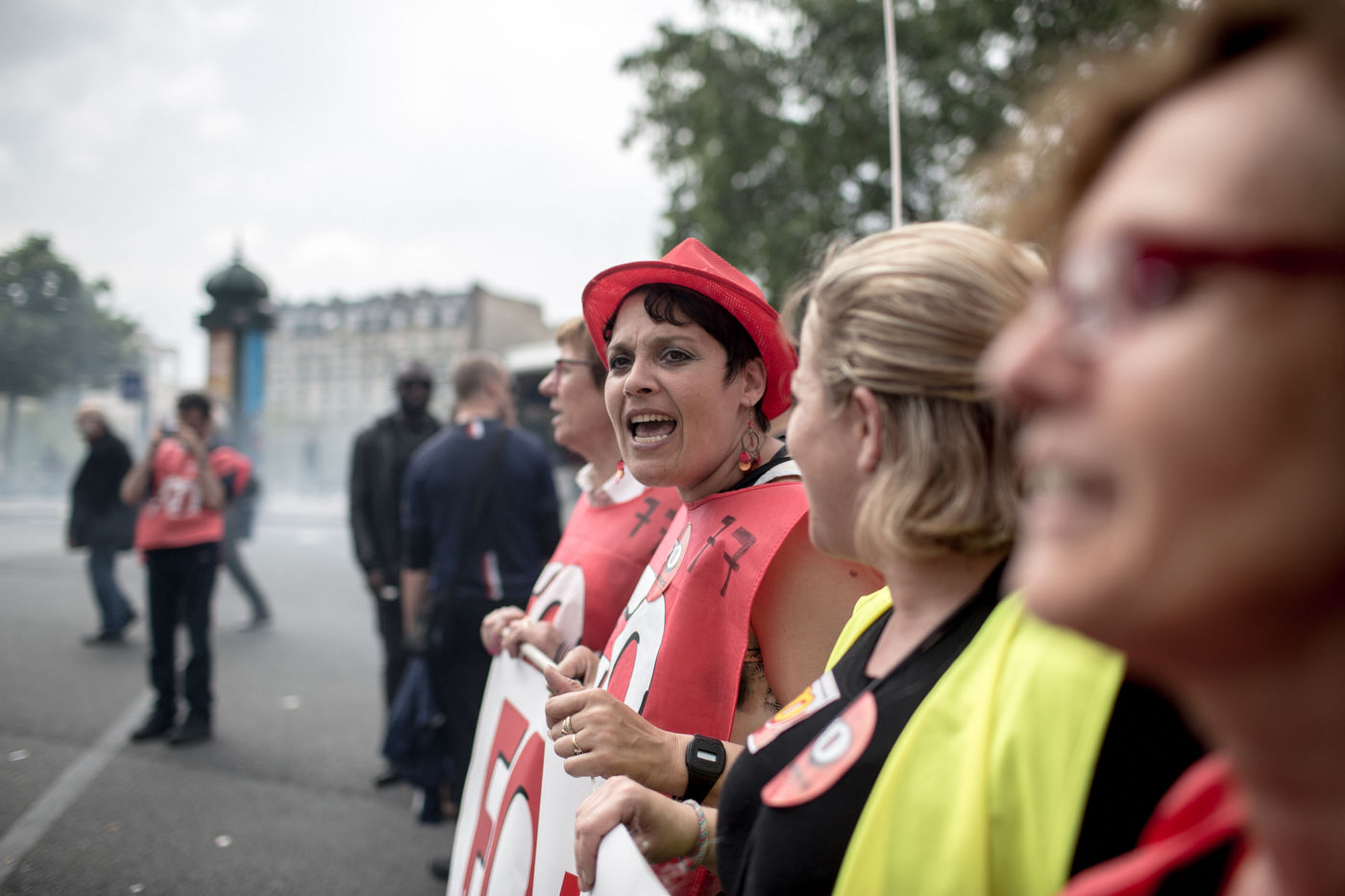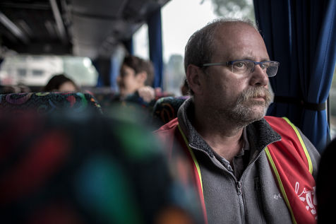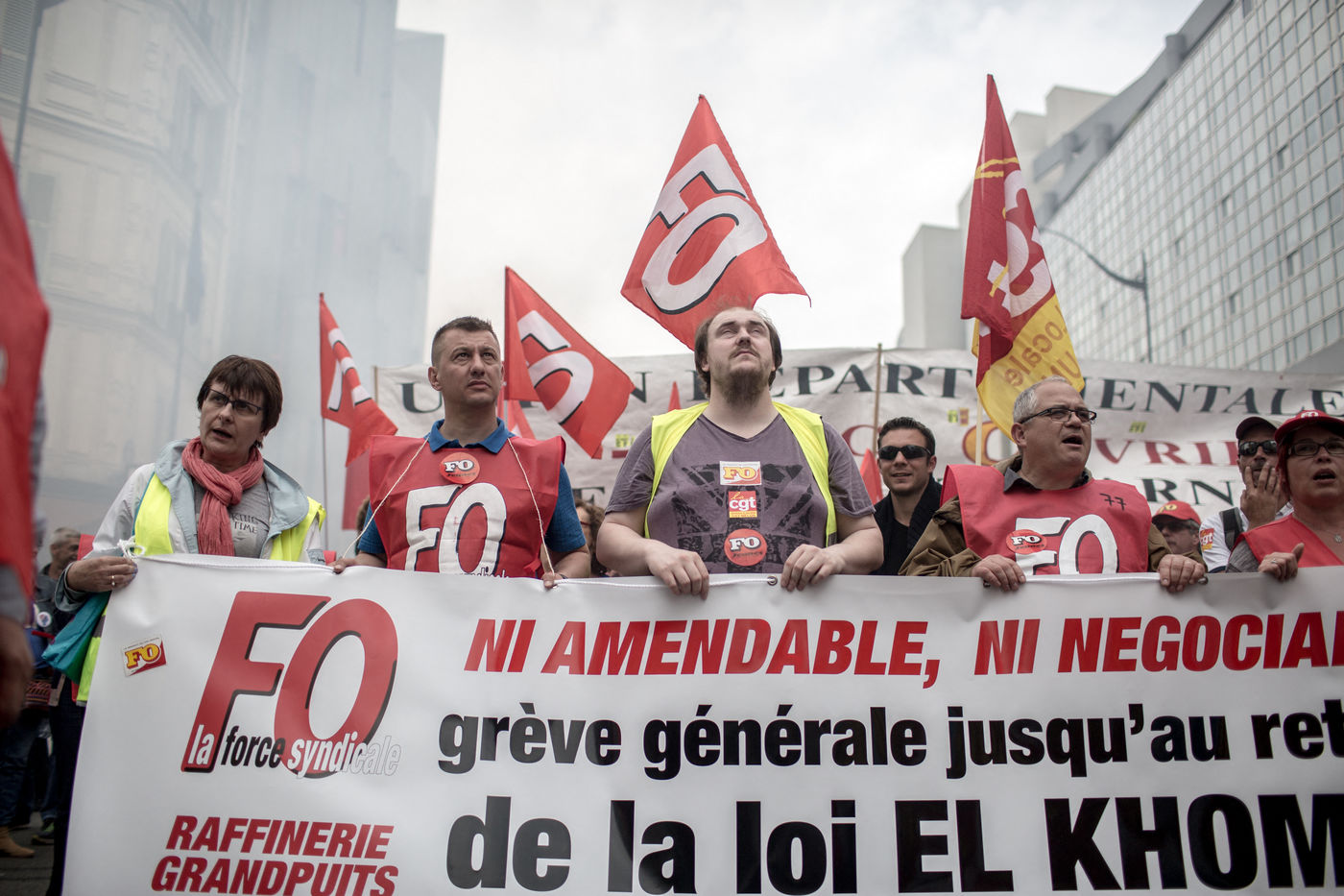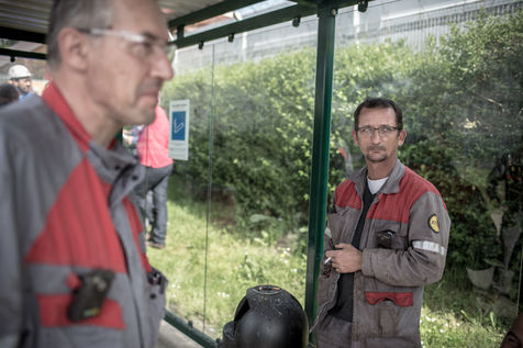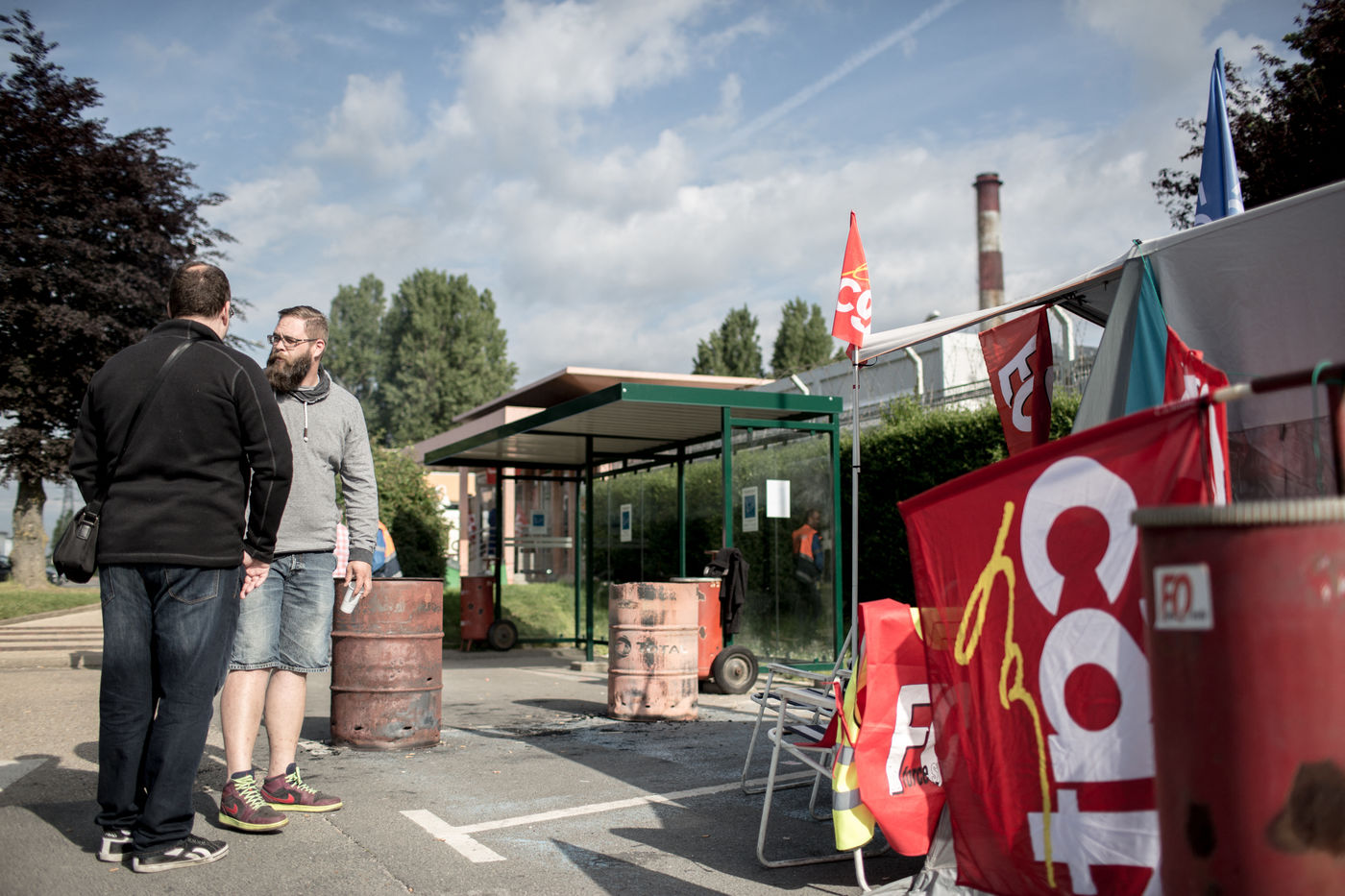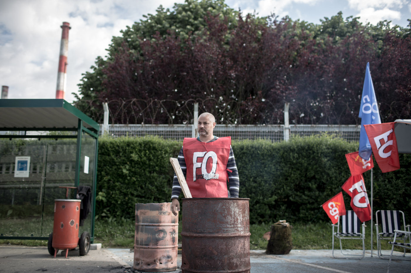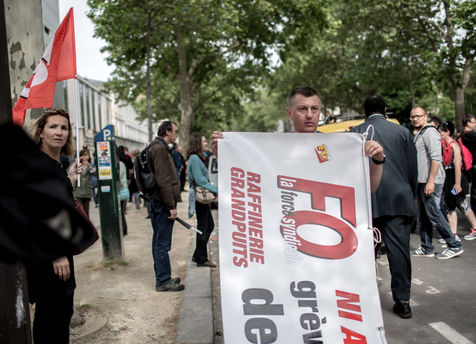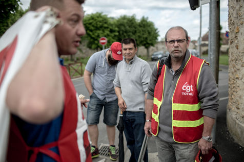Depuis une semaine, les ouvriers de la raffinerie Total de Grandpuits en Seine-et-Marne ont voté à 60 % la grève pour protester contre le projet de loi travail. Les deux principaux syndicats FO et CGT insiste sur le fait que leur site n'est pas bloqué. La grève d'une majorité de salariés de l'entreprise a mécaniquement provoqué l'arrêt de la production. Ce jeudi 26 mai 2016, le piquet de grève est installé devant l'usine depuis la veille. Un groupe de grévistes s'y relaient. Parmi eux, le responsable de FO, Franck Bobard. Ce père de famille n'est pas un militant aguéri de longue date. Il travaille chez Total depuis seulement 5 ans et est investi dans le syndicat depuis 4 ans. Avant, il travaillait dans de petites PME. Son engagement comme celui de ses camardes contre la loi travail est fortement motivé par la dureté du travail qu'il doit accomplir à la raffinerie. Pour lui, cette loi ne ferait que dégrader ses conditions de travail. Avec quelques grévistes Franck rejoint un car affrété par FO pour aller à la manifestation à Paris. Leur cortège est situé loin de la tête de la manifestation, loin des incidents qui ont émaillé une nouvelle fois ce défilé. Lui-même ne se reconnait pas dans ces actes de violence.