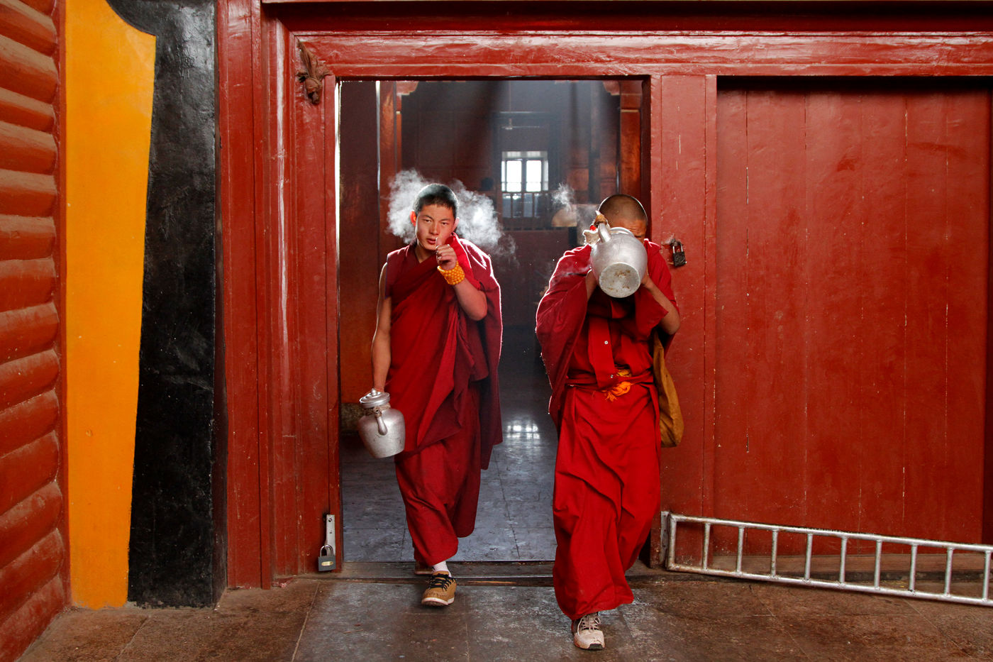 There is a Tibetan region still unknown, the Tibetan Autonomous Prefecture of Garzê. This small Chinese region is a forgotten geographical and cultural treasure. Indeed, it is located outside Tibet sensu stricto (Tibet Autonomous Region whose capital is Lhasa), in the upper Sichuan. Sichuan is a province in west-central China, north of Yunnan and east of Tibet. In the Tibetan Autonomous Prefecture of Garzê (sometimes spelled Ganzi, Garze or Kardzé), valleys over 3000 meters nestle in the heart of the Himalayas. Red and gold monasteries perch on small ocher hills, the inhabitants dressed in traditional clothes go morning and evening to prayer in monasteries and lamasseries, yak herders guide their herds to the pastures. The landscape is surrounded by snow-capped peaks some of which rise to more than 6000 meters. Unlike in Tibet sensu stricto, here in the Tibetan Autonomous Prefecture of Garzê, the foreign traveler is free from his movements, he is not controlled by a guide or agent of the Chinese government. Access to the monasteries is allowed. Unaccustomed to strangers, the monks open their doors to visitors and offer them a salted butter tea with wide astonished smiles. This amazing region includes several administrative subdivisions including Garzê xian and Litang xian where these images were made. In this region is one of the largest Tibetan monasteries, the monastery of Ganzisi, home to several thousand monks in red robes, and one of the few Tibetan nunneries (a monastery reserved for women). These images explore the universe and the daily life of a culture in perdition on the borders of China.