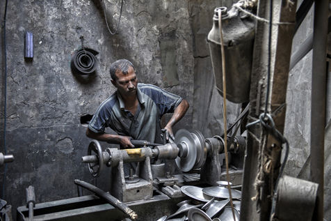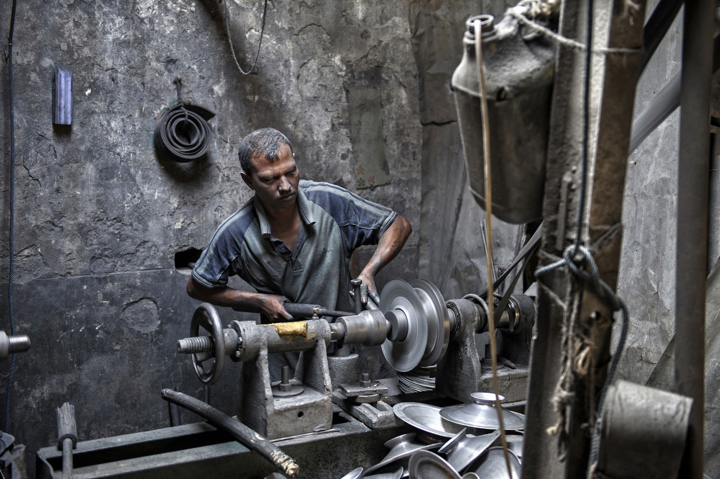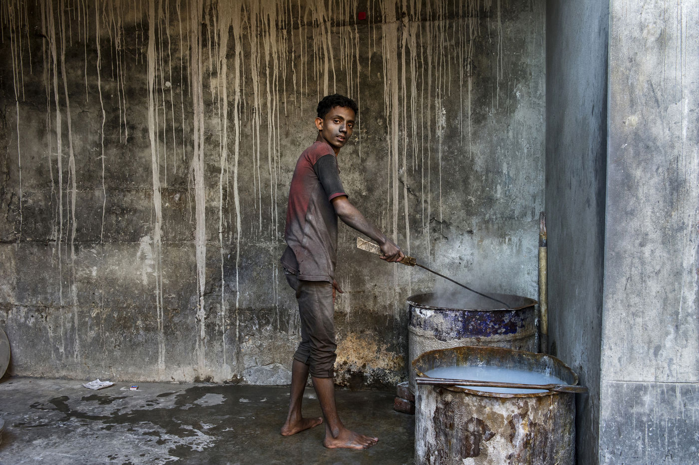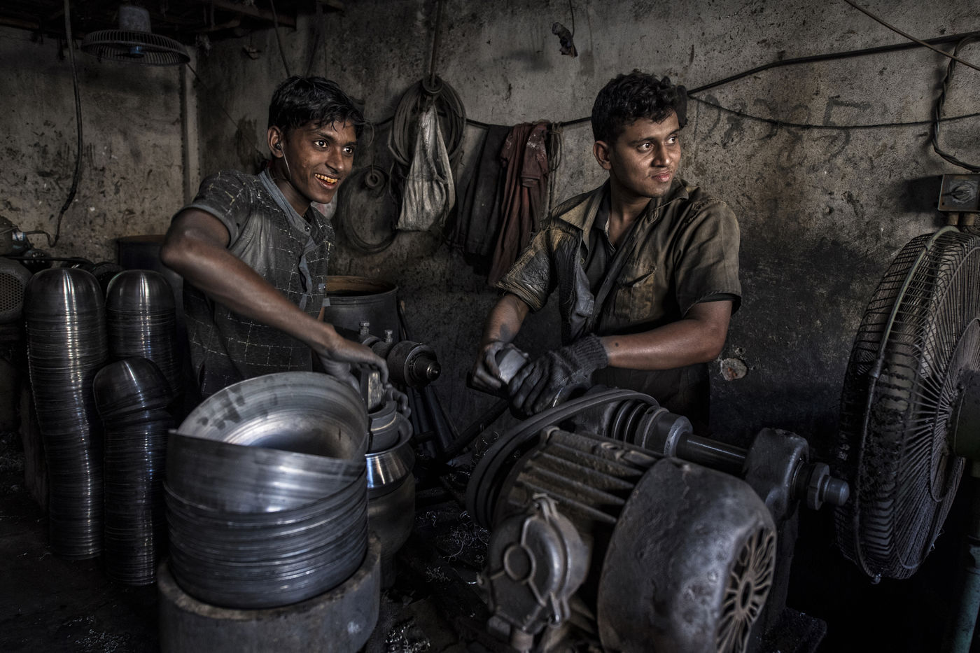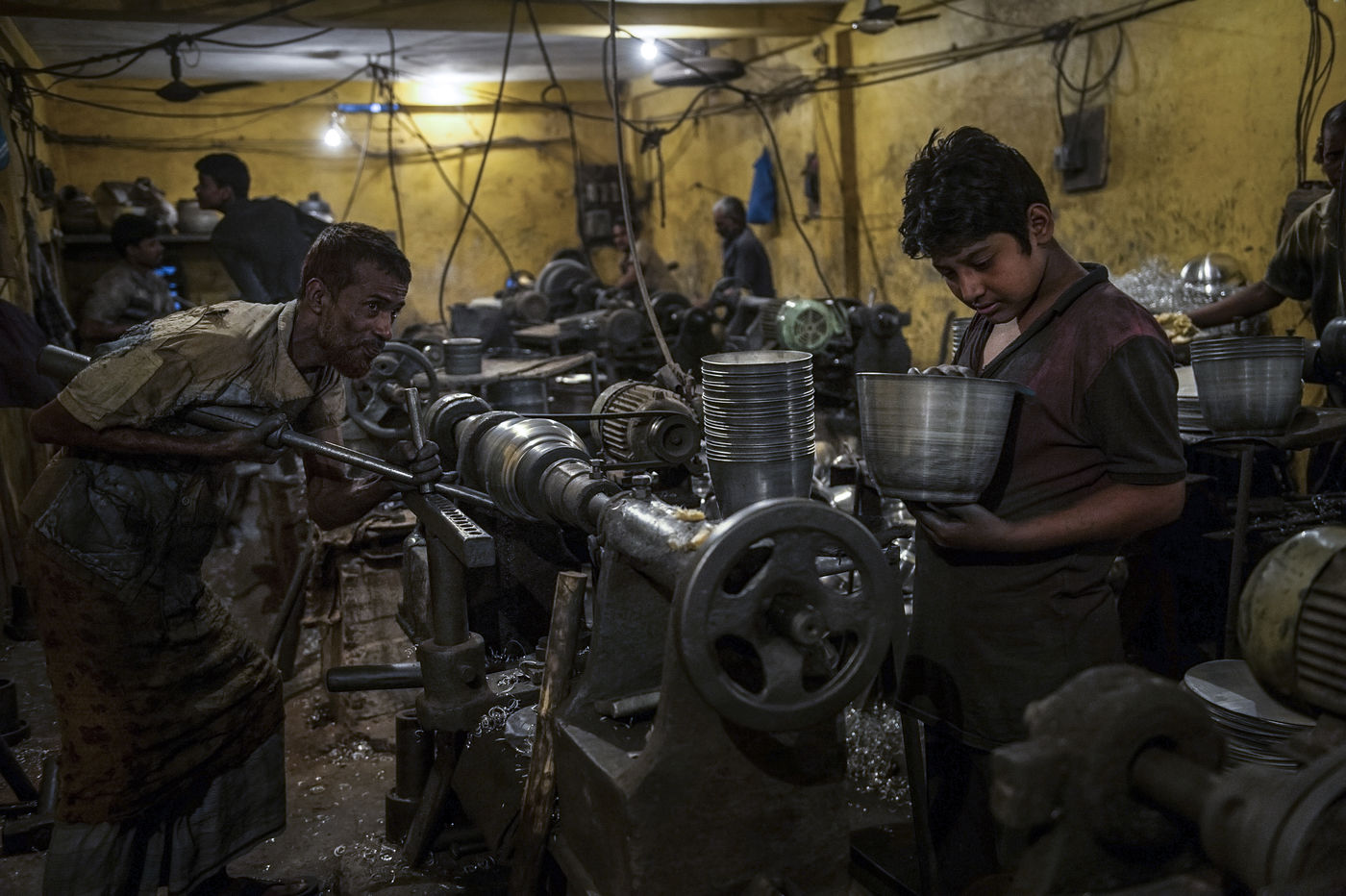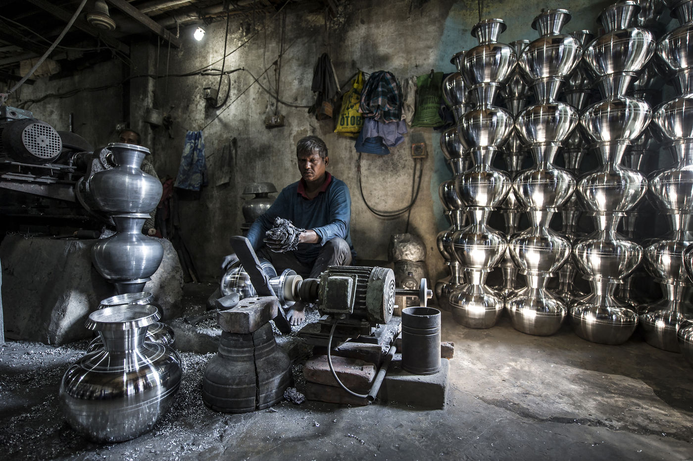 There are many aluminium factories in Bangladesh where different types of pots and pans are made from recycled and melted aluminium. To produce an aluminium pan, bowl, kettle or kettle, this aluminium must first be melted, transformed into ingots, rolled and then cut into discs. Then comes anodizing, a chemical process to prevent objects from rusting. The aluminium discs are dipped in sulphuric acid and then caustic soda. The work is dangerous and toxic. The discs are then formed with the force of the arms on rotating machines to obtain the kitchen utensils. The final touch is the sandpaper polishing that you attach to your hands and feet.