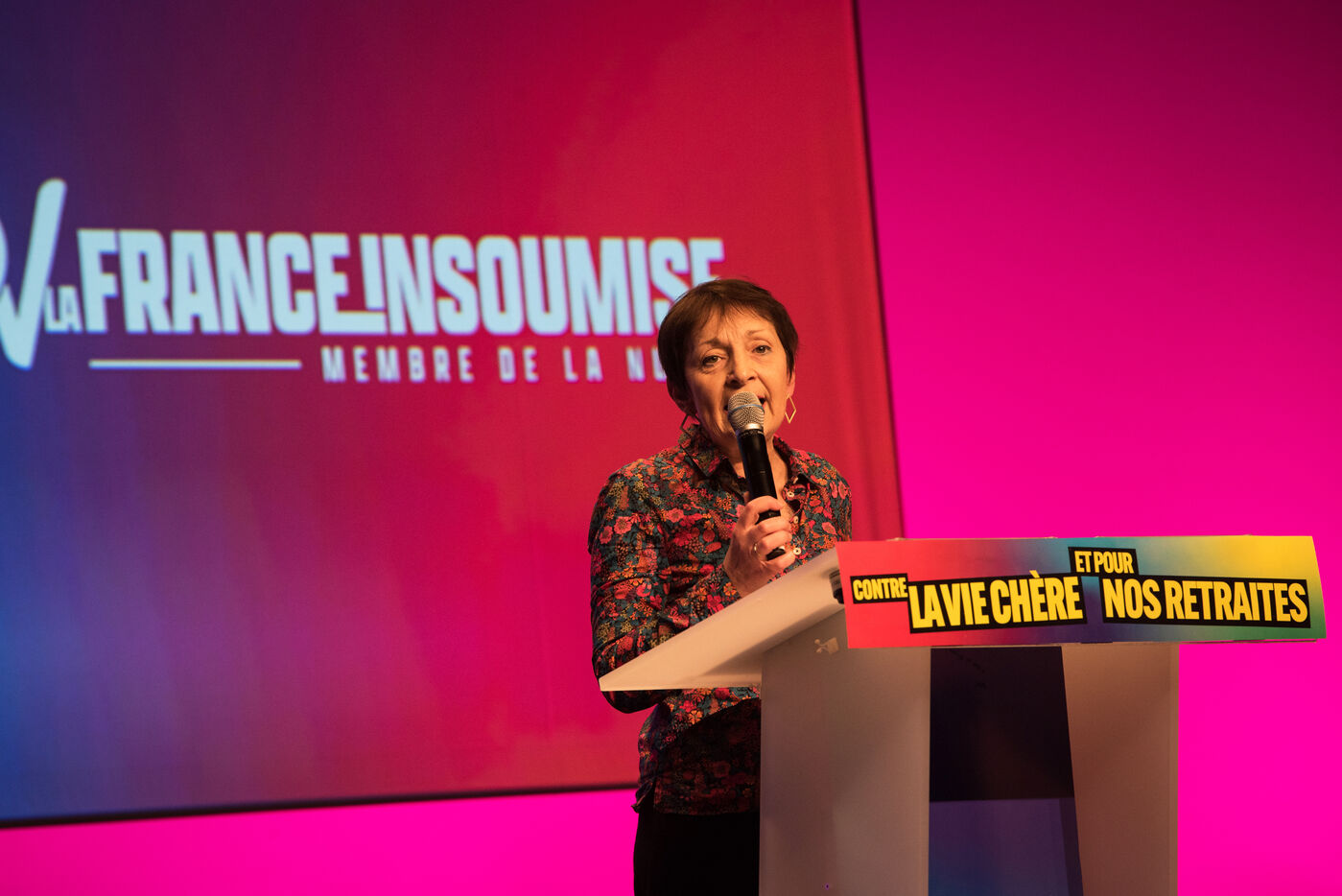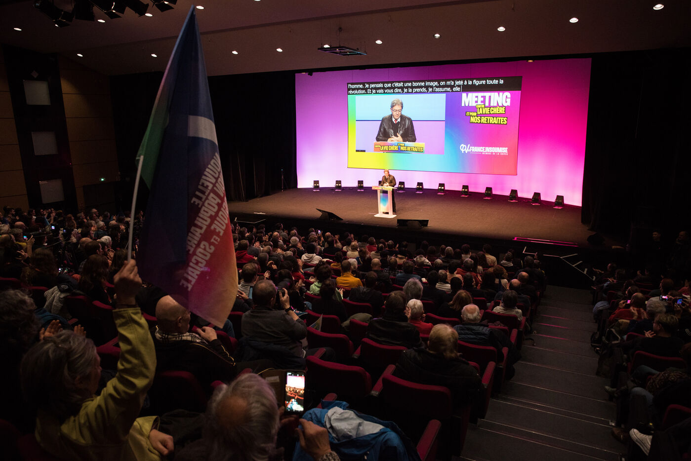 Le 16 décembre 2022, au Centre de Congrès de Saint-Etienne, Jean-Luc Mélenchon et la députée ligérienne Andrée Taurinya, sont en meeting contre la vie chère.