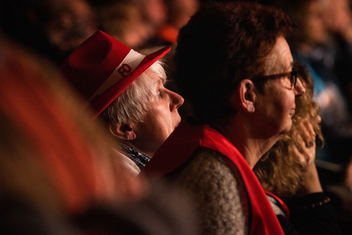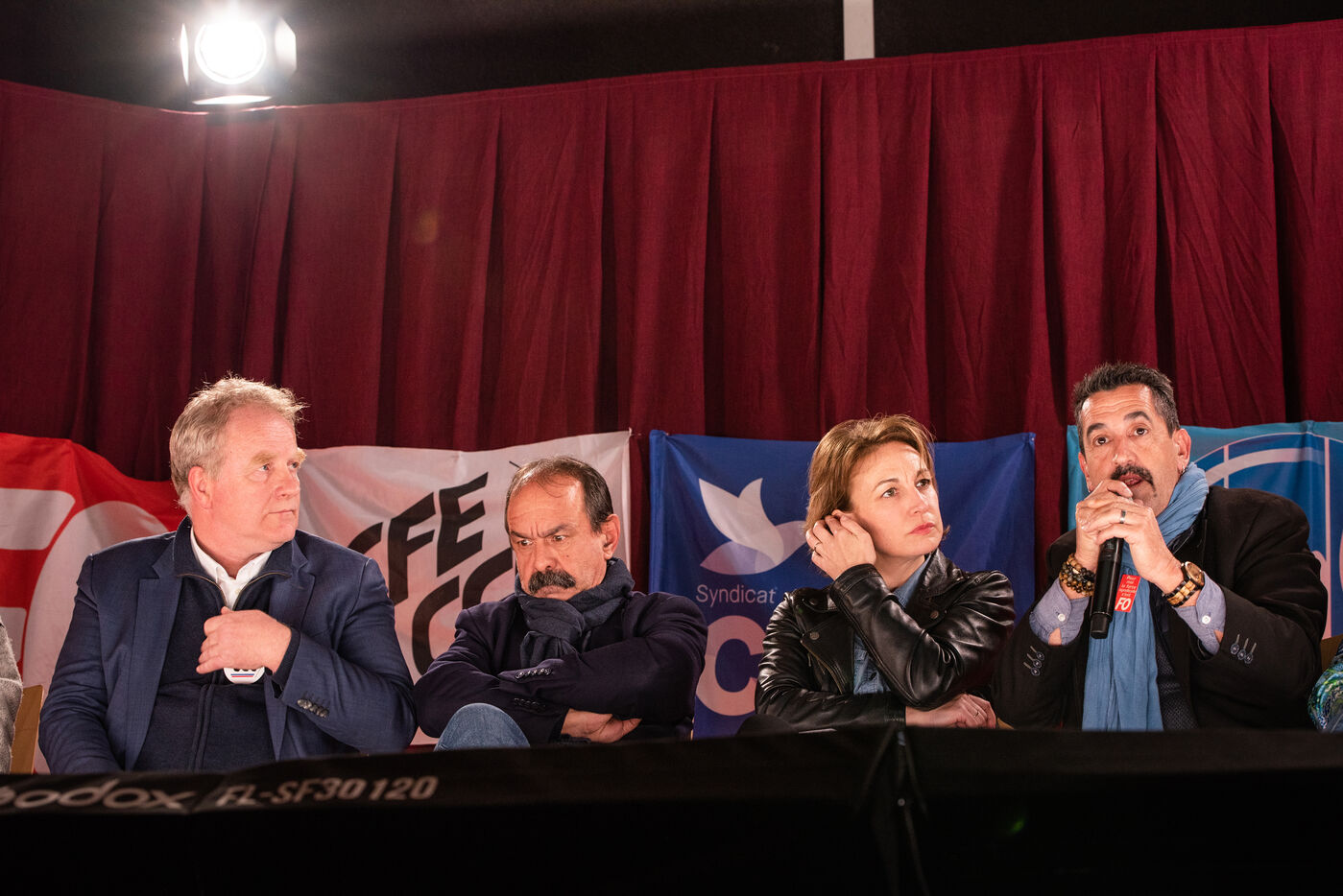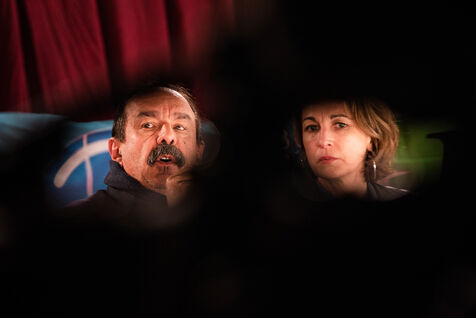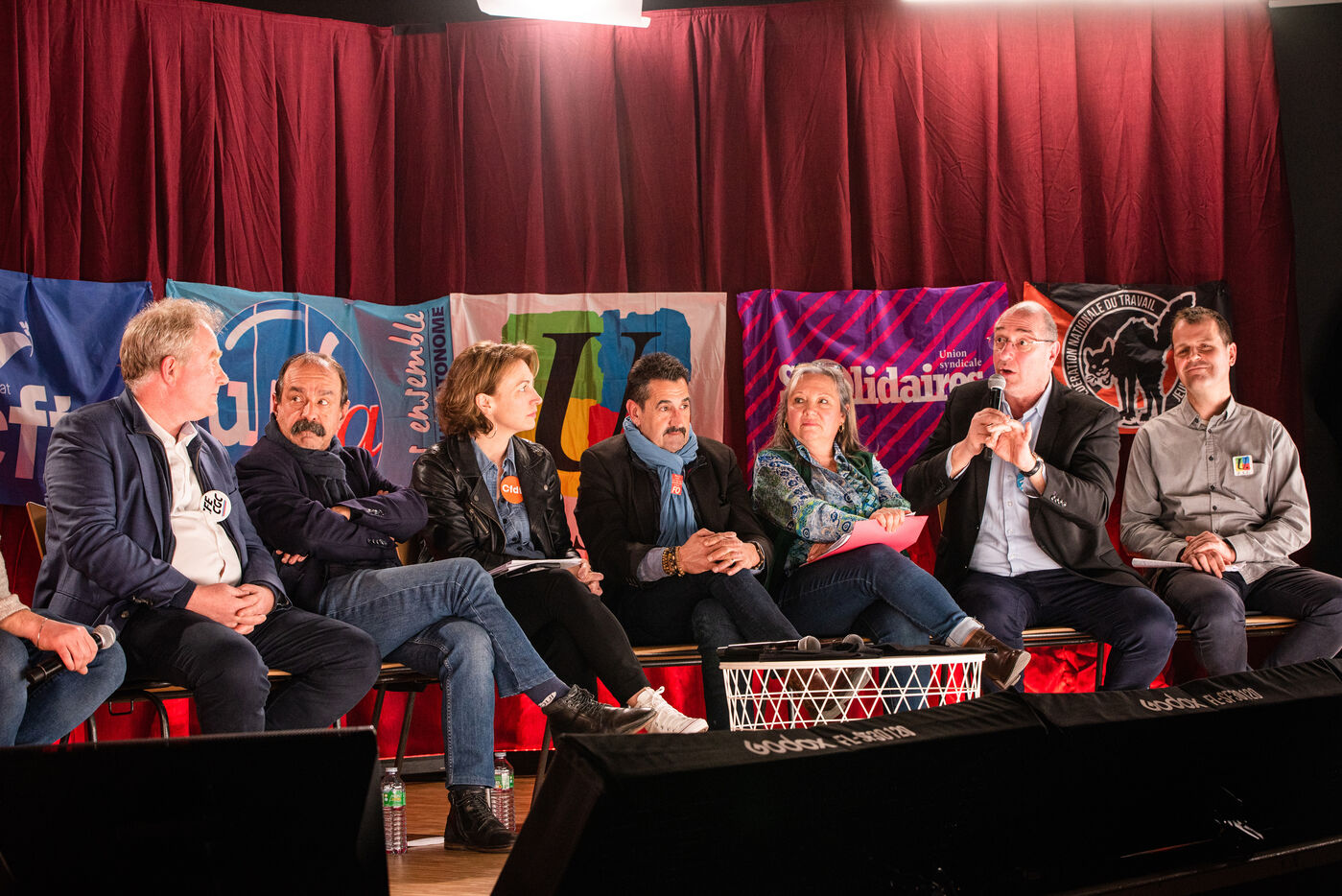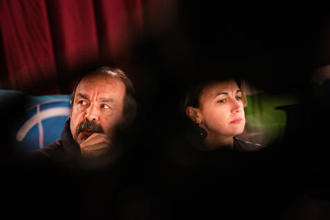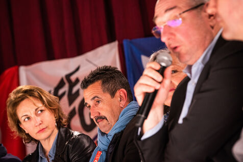 Environ un millier de personnes se sont retrouvées le jeudi 2 mars 2023 à la Ricamarie, dans le departement de la Loire, pour un grand débat public contre le projet de réforme des retraites du Gouvernement. Les principaux leaders syndicaux français ont répondu à l'appel.