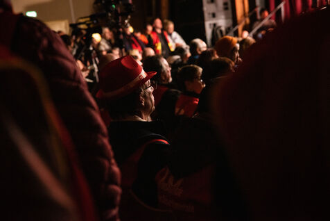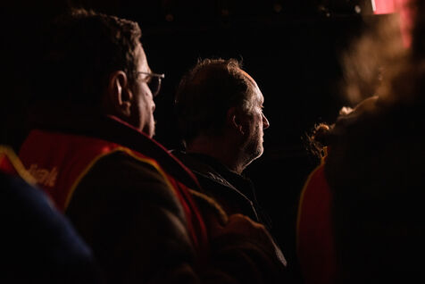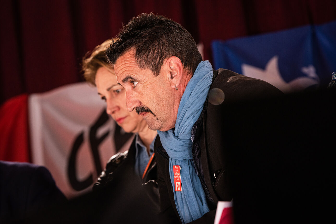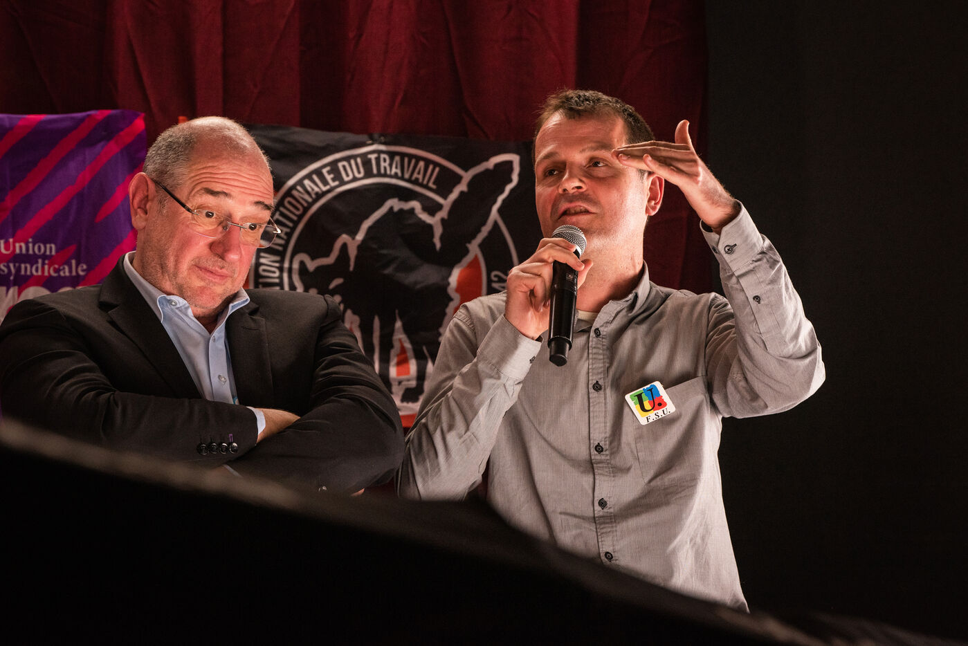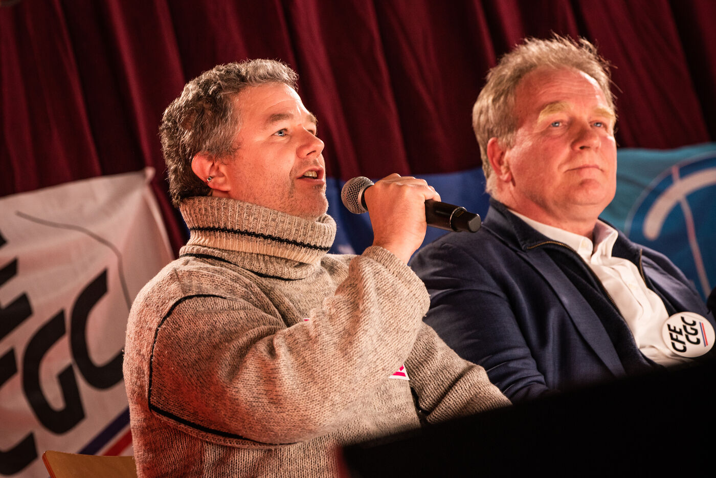 Environ un millier de personnes se sont retrouvées le jeudi 2 mars 2023 à la Ricamarie, dans le departement de la Loire, pour un grand débat public contre le projet de réforme des retraites du Gouvernement. Les principaux leaders syndicaux français ont répondu à l'appel.