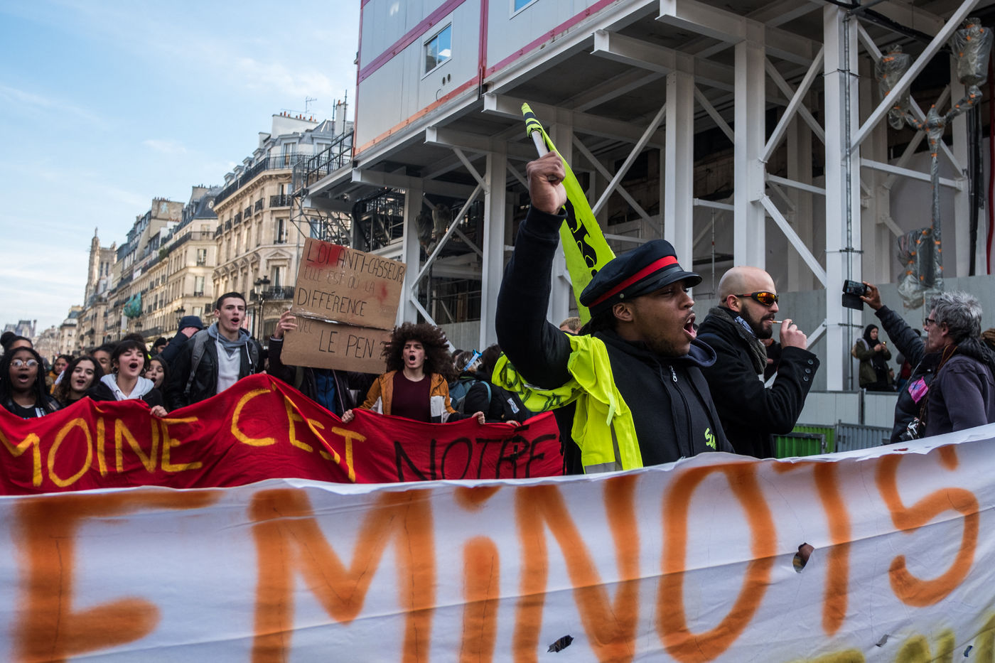 Manifestation de "Grève générale" interprofessionnelle à l'appel des syndicats CGT, Sud Solidaires et de Gilets Jaunes pour la justice sociale et le pouvoir d'achat. Cette manifestation a réunie pour la première fois, syndicats, Gilets Jaunes, étudiants, lycéens et anarchistes autonomes.
