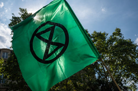 Action pacifiste du groupe Extinction Rébellion à Paris, en réaction aux incendies en Amazonie et à l'inaction des états.