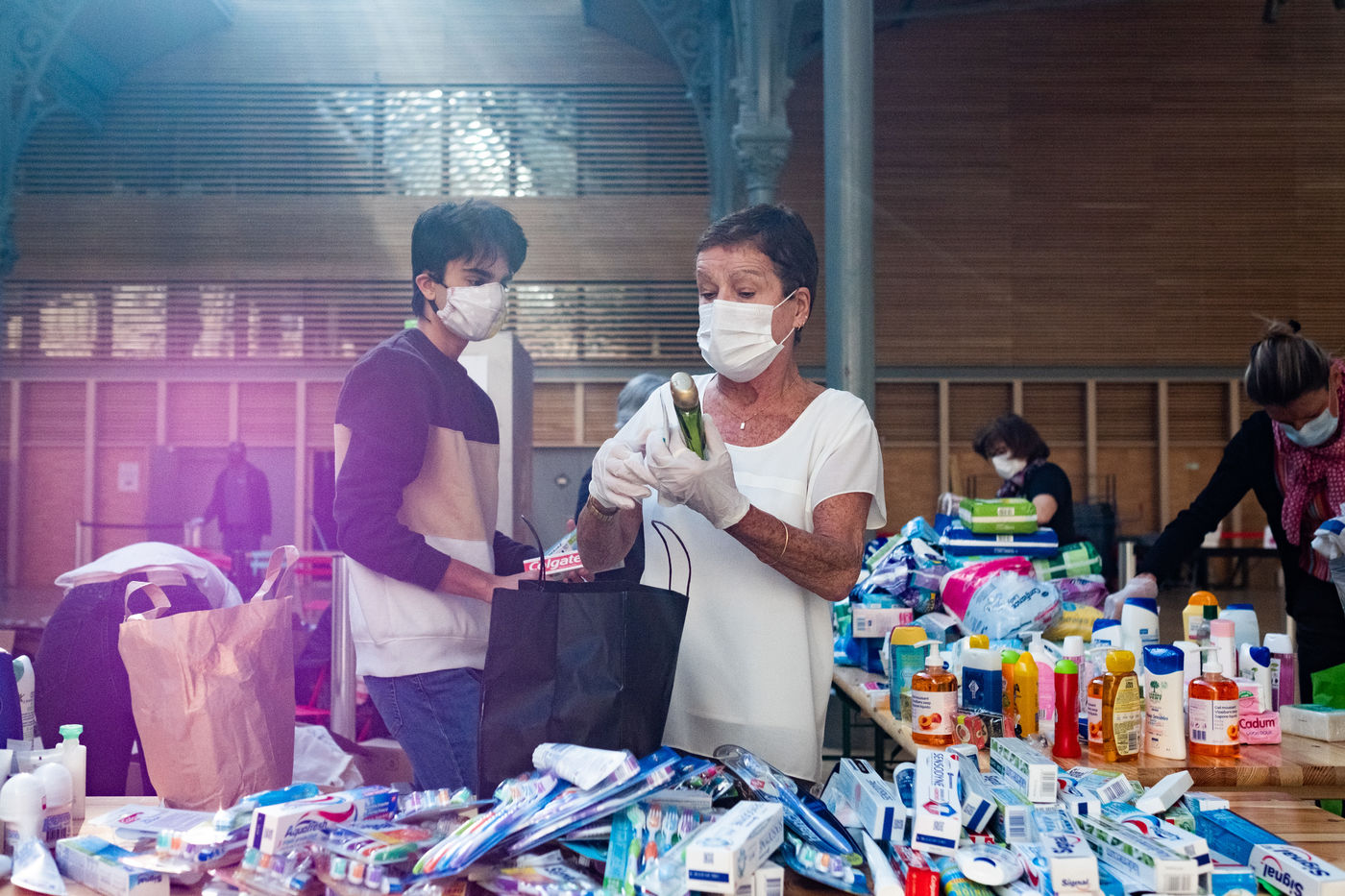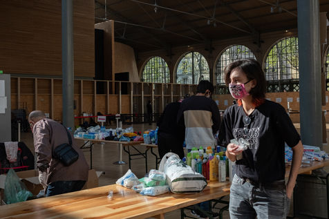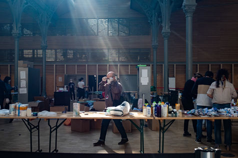 Le Centre d'Action Sociale de la Ville de Paris dont La Fabrique de la solidarité avec le Samu Social, ont organisé une collecte de dons de produits d'hygiènes, de vêtements et d'aide alimentaire pour les sans abris. A l'appel de La Fabrique de la solidarité, Le jeudi 14 Avril est organisé la fabrication de ces kits avec des parisiens volontaires au Carré des Blancs Manteaux, réquisitionné par la ville pendant la crise sanitaire pour l'aide aux personnes en grande précarité.