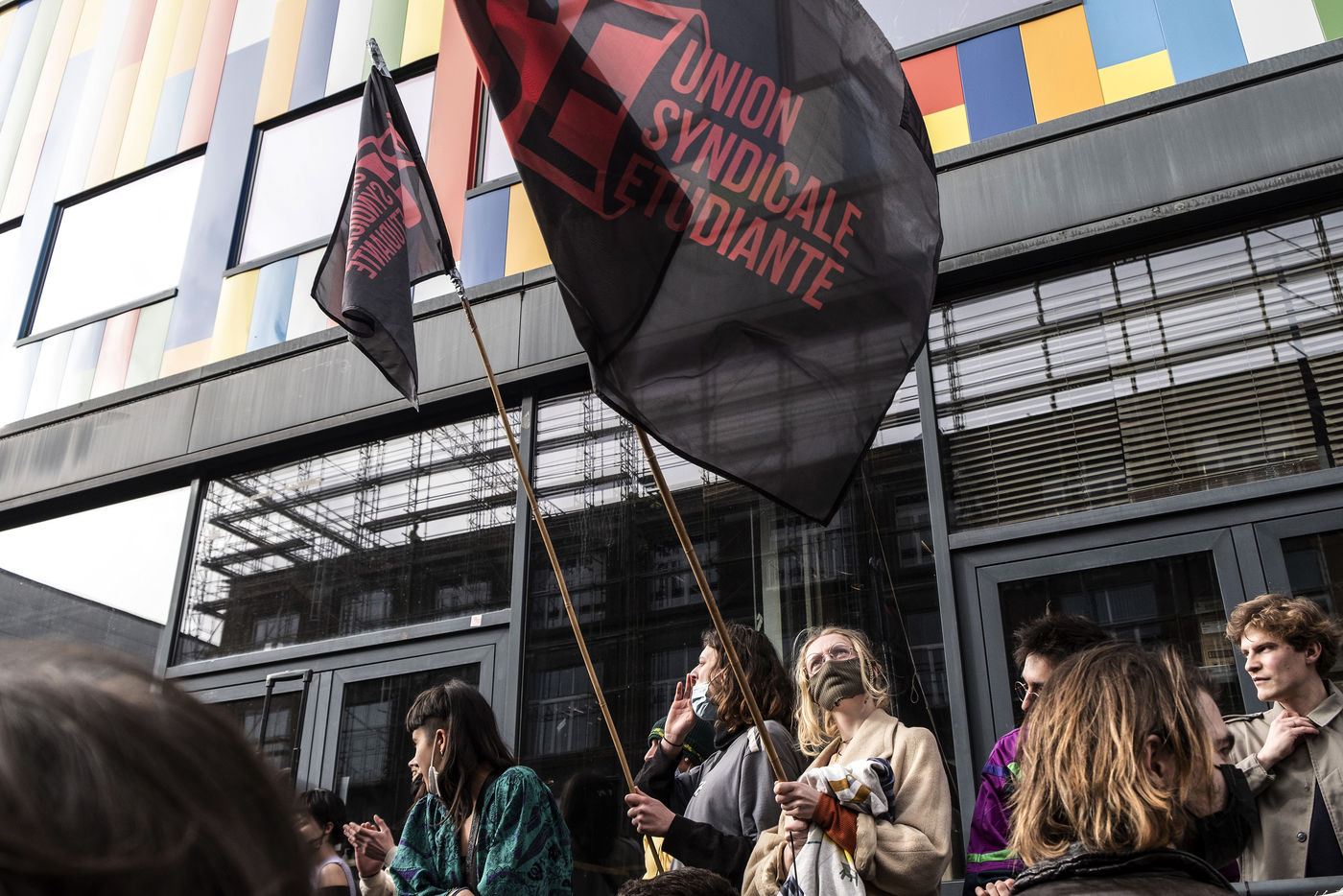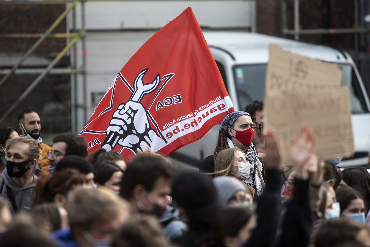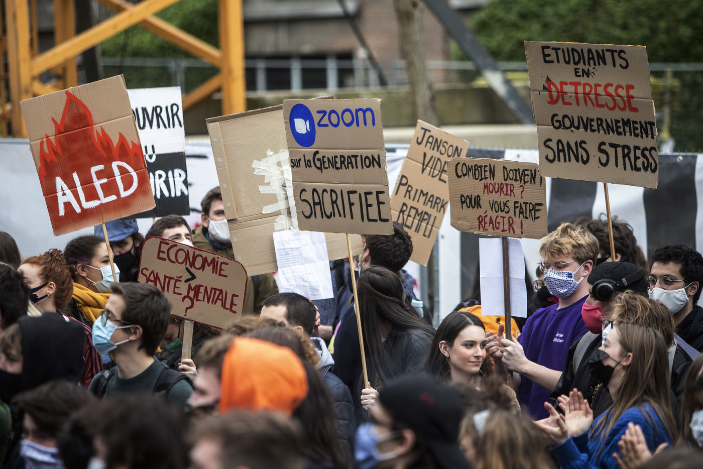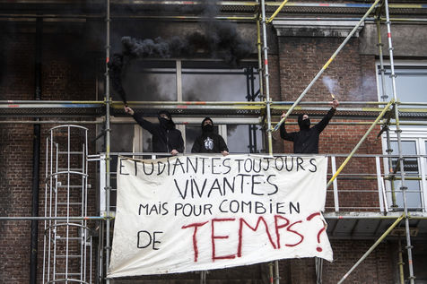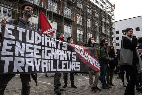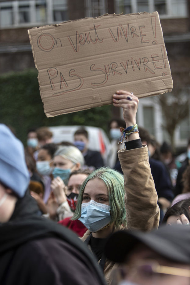 Students protest at Libre University in Brussels against the isolation and precariousness due to the Covid-19 crisis. They denounce the lack of resources put in place since the start of the pandemic, as well as the insufficiency of the new measures announced and the non-consultation of the government and universities with students with respect to the decisions taken.