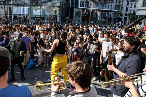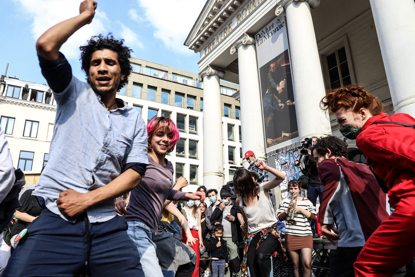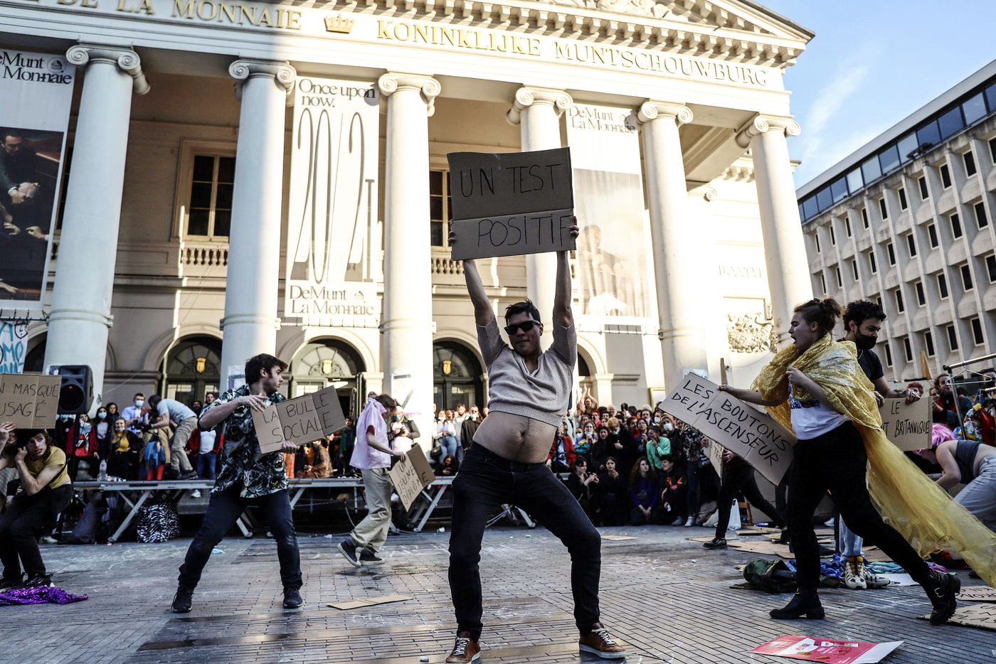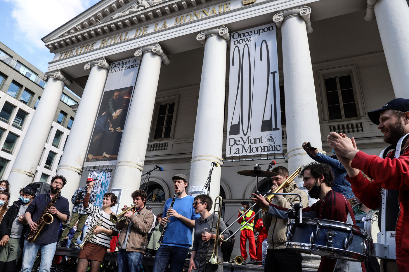 Dernier jour d'occupation du théâtre La Monnaie à Bruxelles. La police intervient pour expulser les occupants. Le théâtre avait été occupé le 3 Avril 2021 par un collectif d'artistes, de travailleurs du secteur culturel et d'étudiants pour protester contre la gestion de la crise sanitaire par le gouvernement fédéral, notamment en ce qui concerne les employés du secteur culturel et artistique et de l'hôtellerie.