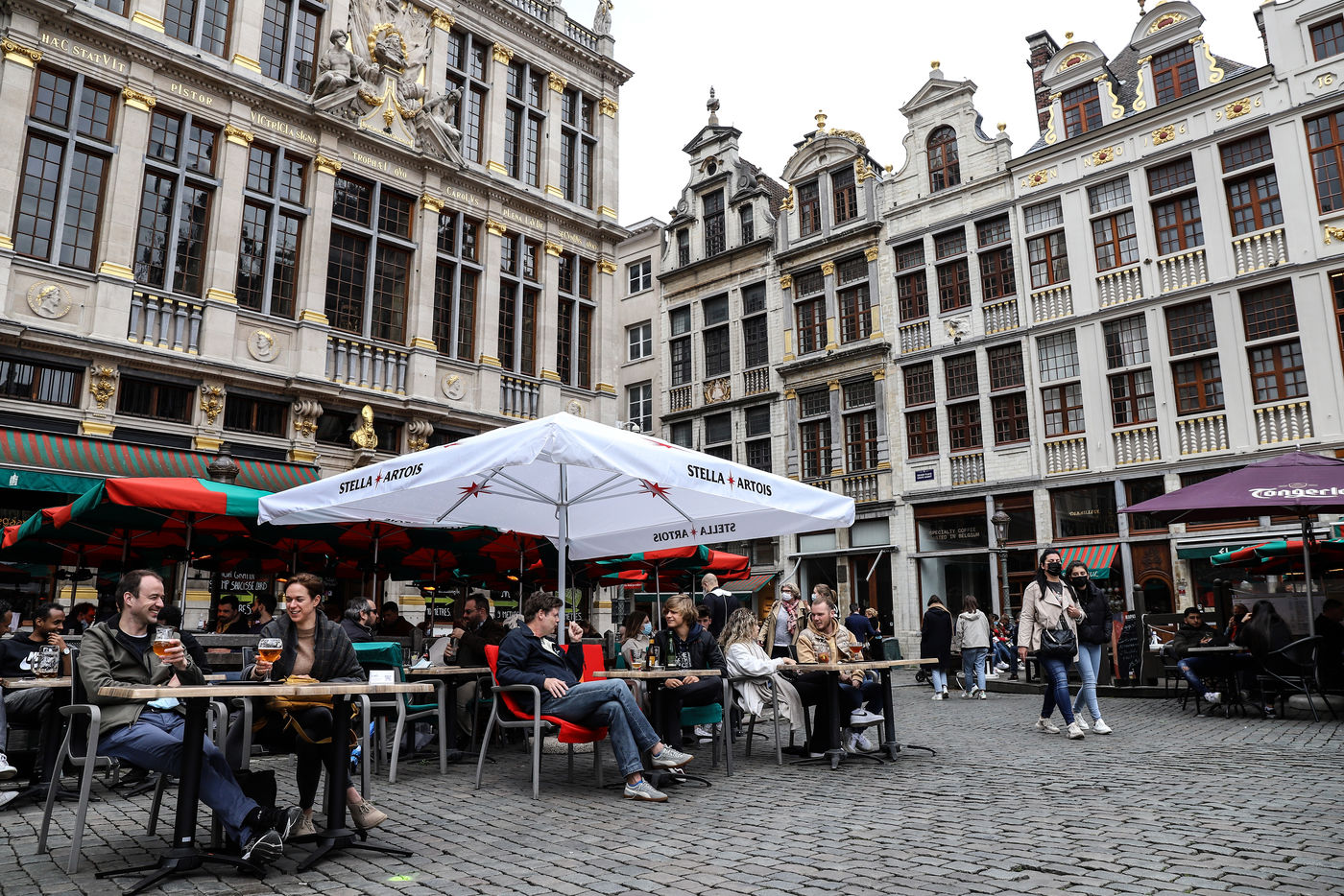 Les terrasses des bars en Belgique réouvrent apres une longue fermeture imposée par le gouvernement pour contenir la diffusion du Covid-19. Bruxelles, Belgique, 8 Mai 2021.