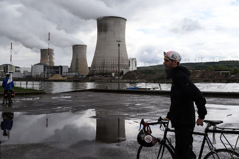 Un groupe d'écologistes en vélo manifestent devant la centrale nucléaire de Tihange en Belgique. La démonstration fait partie du tour Dégaze, un parcours vélo de 6 jours reliant 8 sites en Belgique où la construction de nouvelles centrales à gaz est en projet.