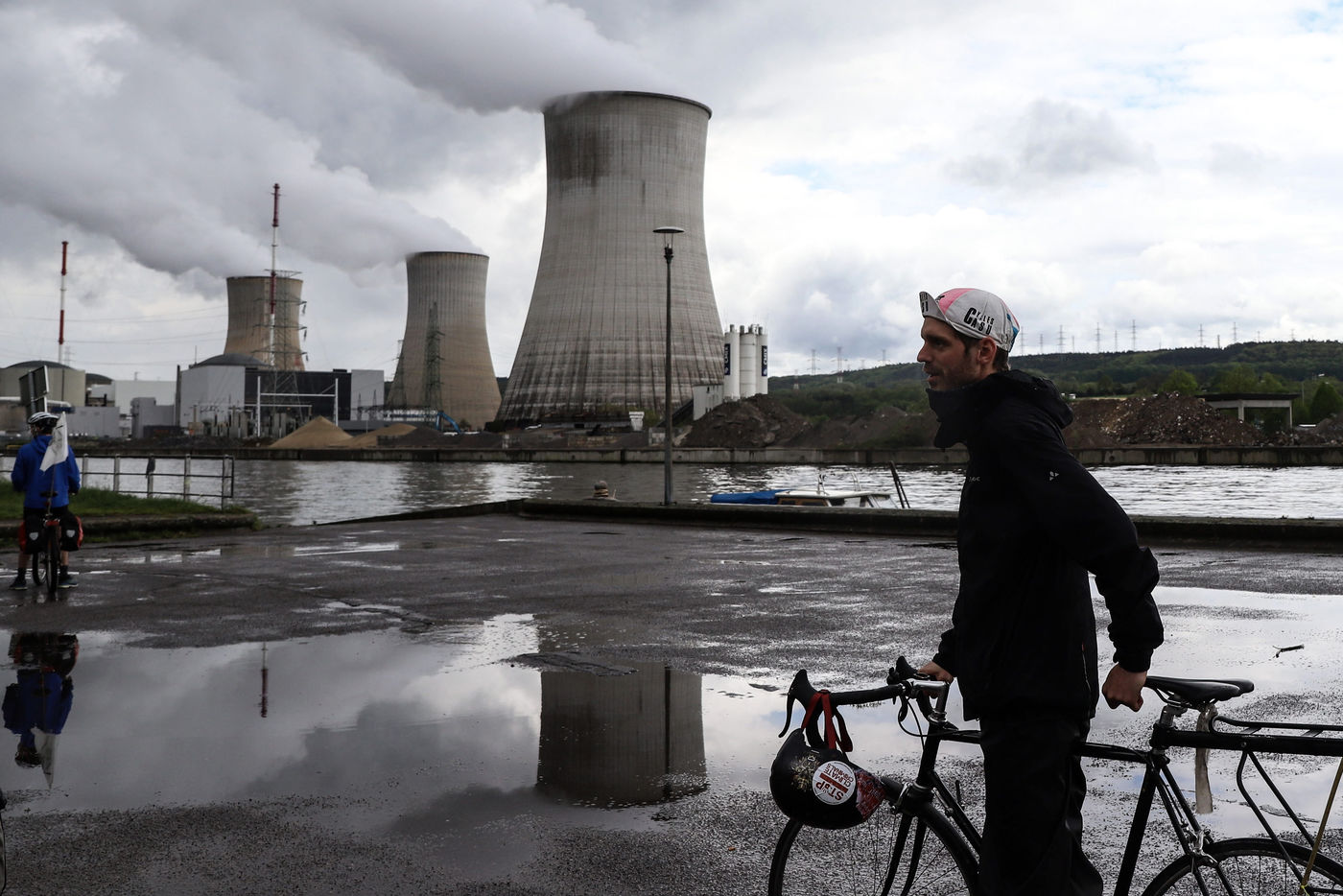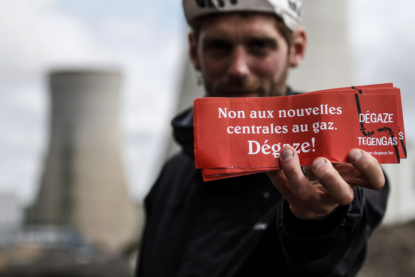 Environmentalist bikers demonstrate in front of Tihange nuclear plant. The demonstration is part of the Degaze tour, a 6-day biking tour linking 8 sites in Belgium where the construction of new gas power plants has been planned.