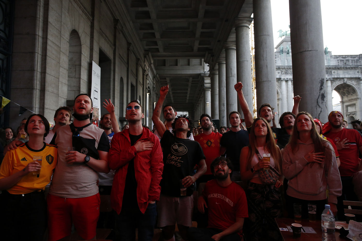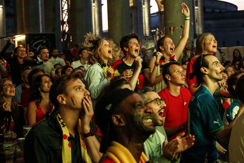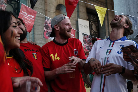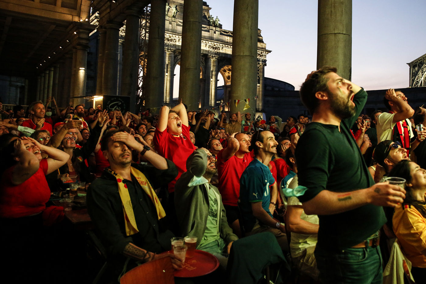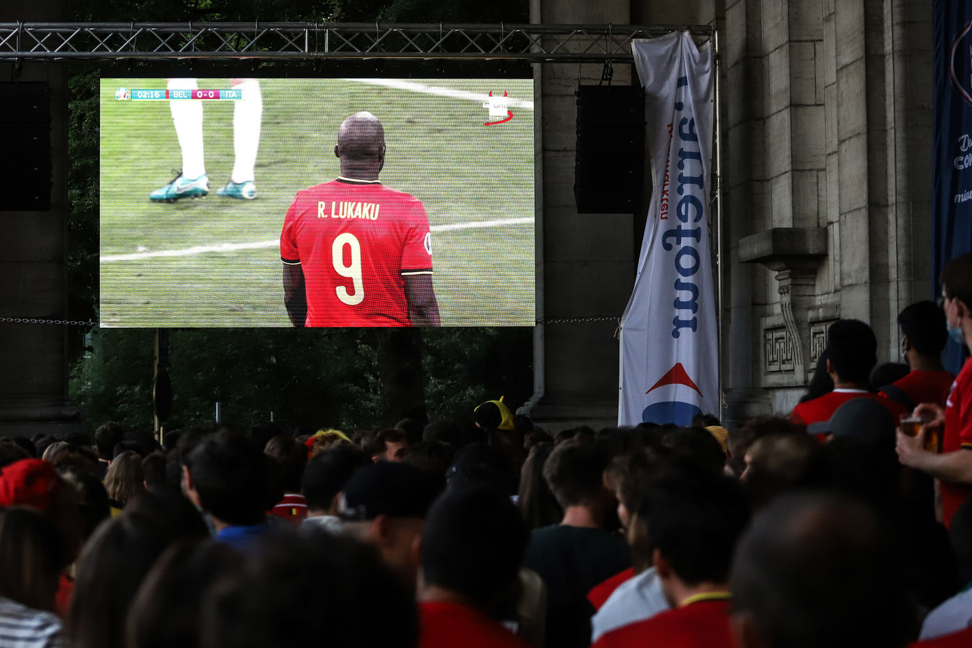 Belgian and Italian supporters watch the soccer match Euro 2020 Belgium-Italy at the Football Village of Cinquantenaire Park in Brussels. The match ended 2-1 for Italy. After the match, there were clashes between Belgian supporters and the police in the city center. Brussels, Belgium, July 2, 2021.