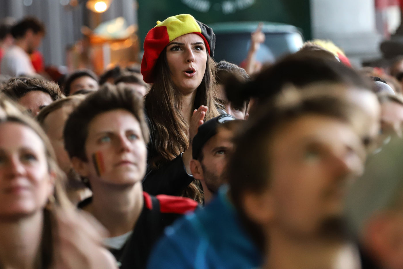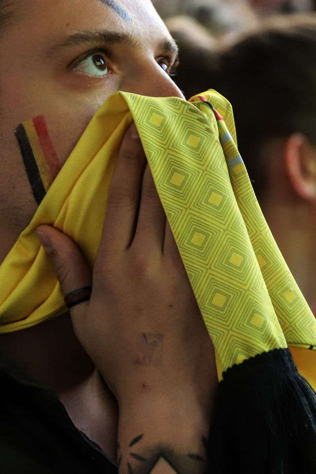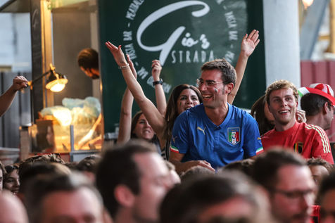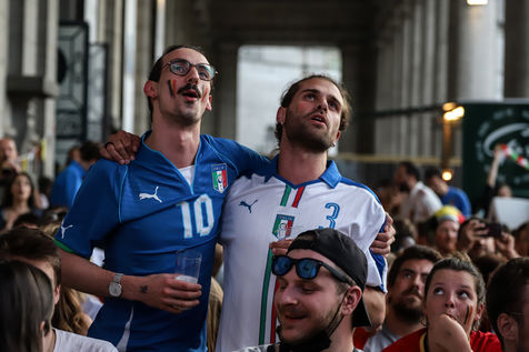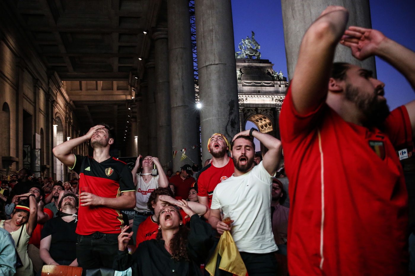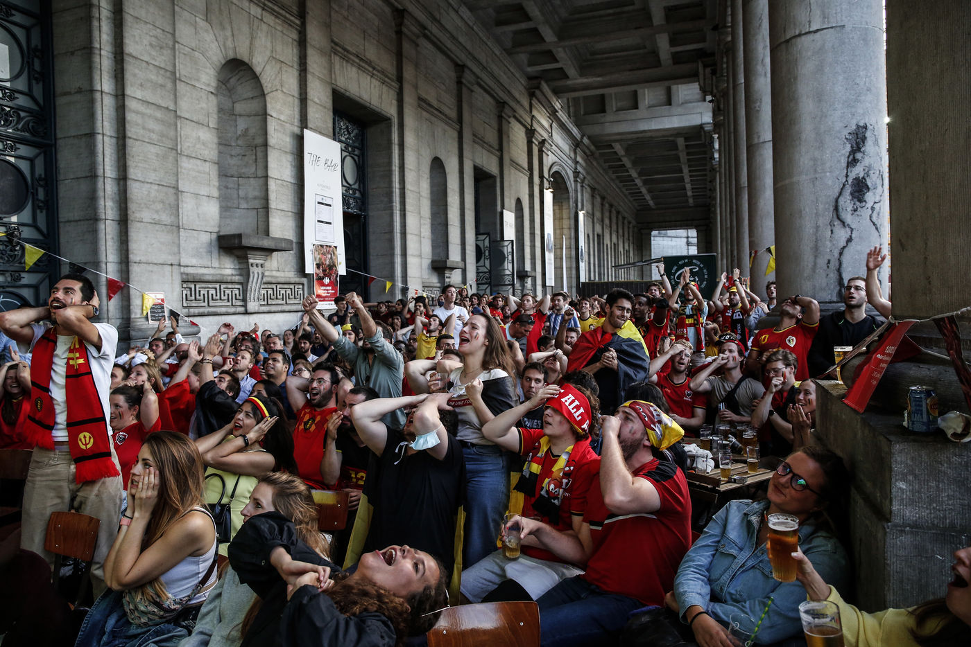 Belgian and Italian supporters watch the soccer match Euro 2020 Belgium-Italy at the Football Village of Cinquantenaire Park in Brussels. The match ended 2-1 for Italy. After the match, there were clashes between Belgian supporters and the police in the city center. Brussels, Belgium, July 2, 2021.