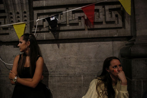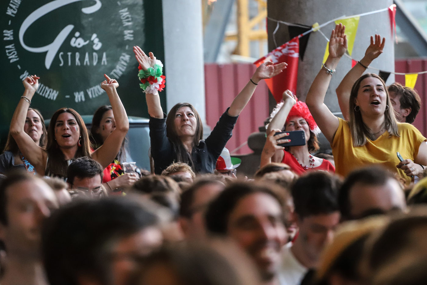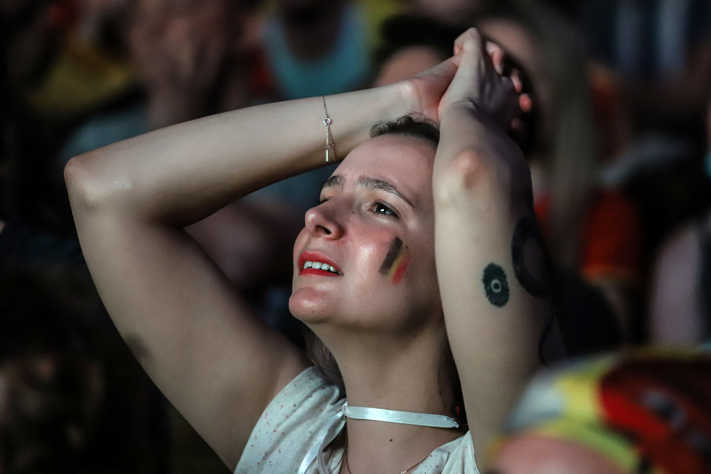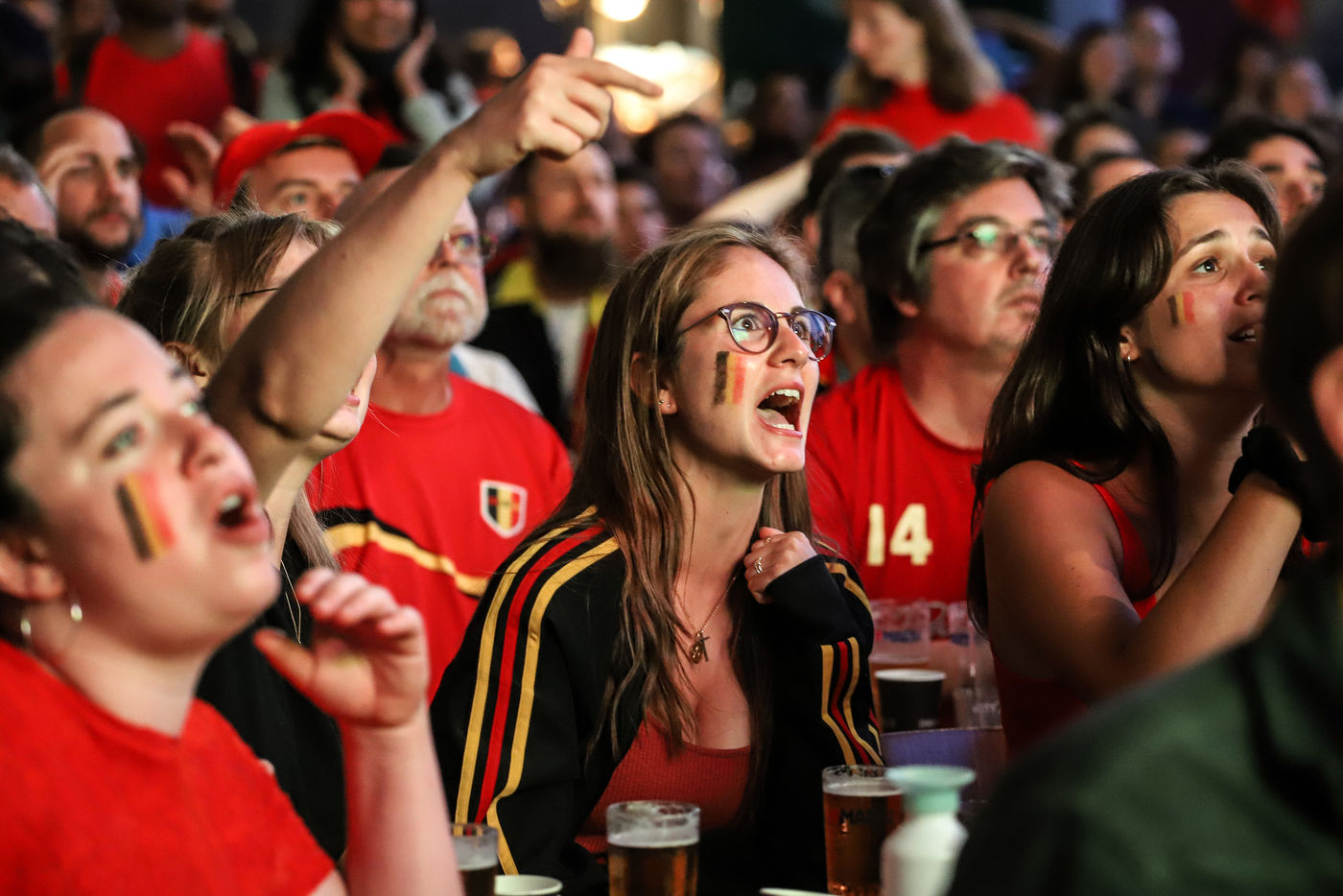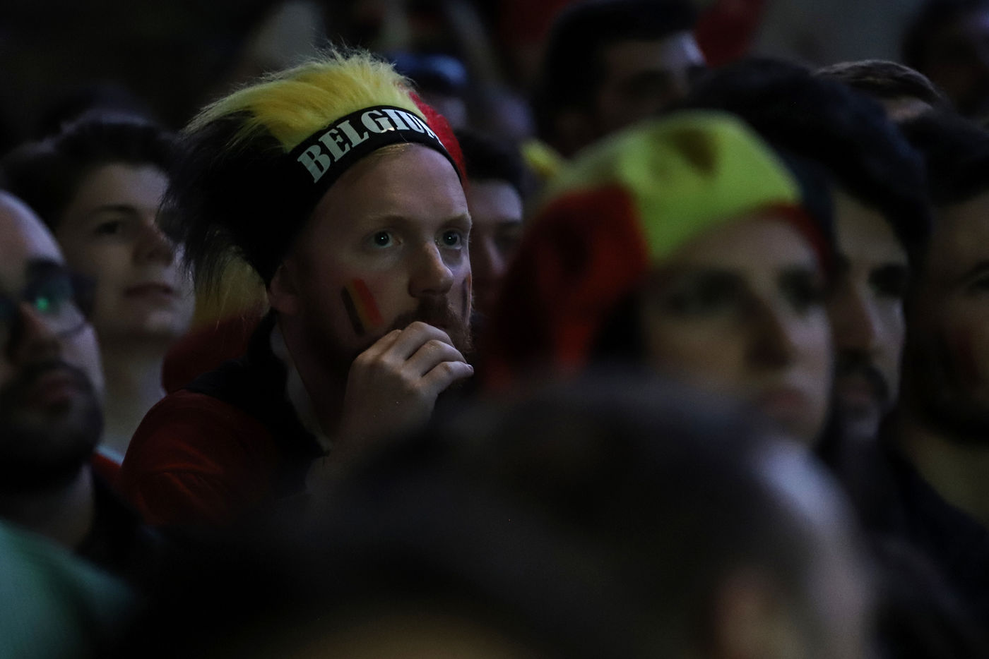 Belgian and Italian supporters watch the soccer match Euro 2020 Belgium-Italy at the Football Village of Cinquantenaire Park in Brussels. The match ended 2-1 for Italy. After the match, there were clashes between Belgian supporters and the police in the city center. Brussels, Belgium, July 2, 2021.