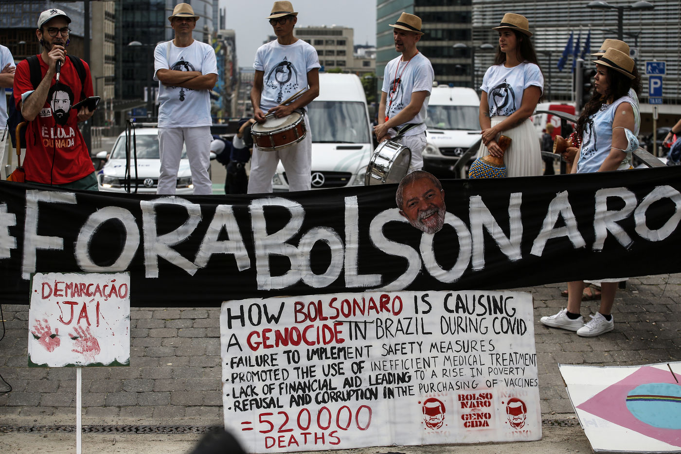 Manifestation contre le Président brésilien Jair Bolsonaro et sa gestion de la crise sanitaire à proximité des institutions européennes. Bruxelles, Belgique, Juillet 24, 2021.