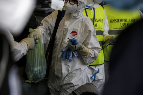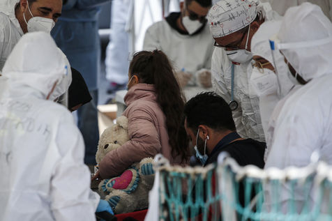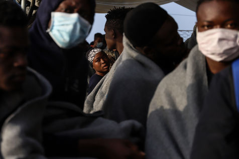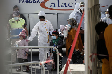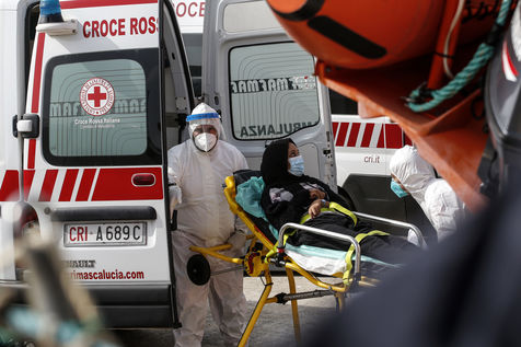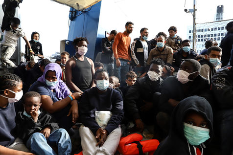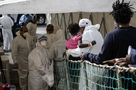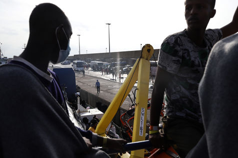 Migrants are disembarked by Italian Red Cross members and health personnel from the rescue ship Sea-Watch 3 at the port of Pozzallo, Sicily, Italy. Between October 17 and 18, 2021, the NGO rescued 412 migrants on seven different distressed boats in the Libyan SAR zone, roughly 30 miles from Libya.