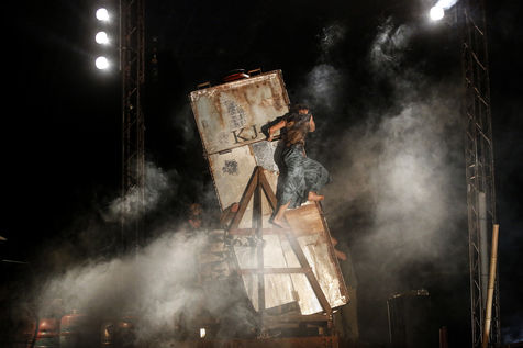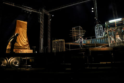 Artists of the contemporary circus company MagdaClan perform the show weLAND at the Tour&Taxis site in Brussels. The show represents the climate crisis and aims to engage the public in understanding the relationship between climate change and migration. After a tour in eight European countries, the last shows take place at the same time as COP26. Brussels, Belgium November 11, 2021.