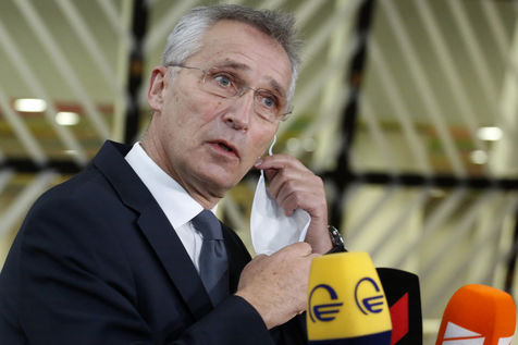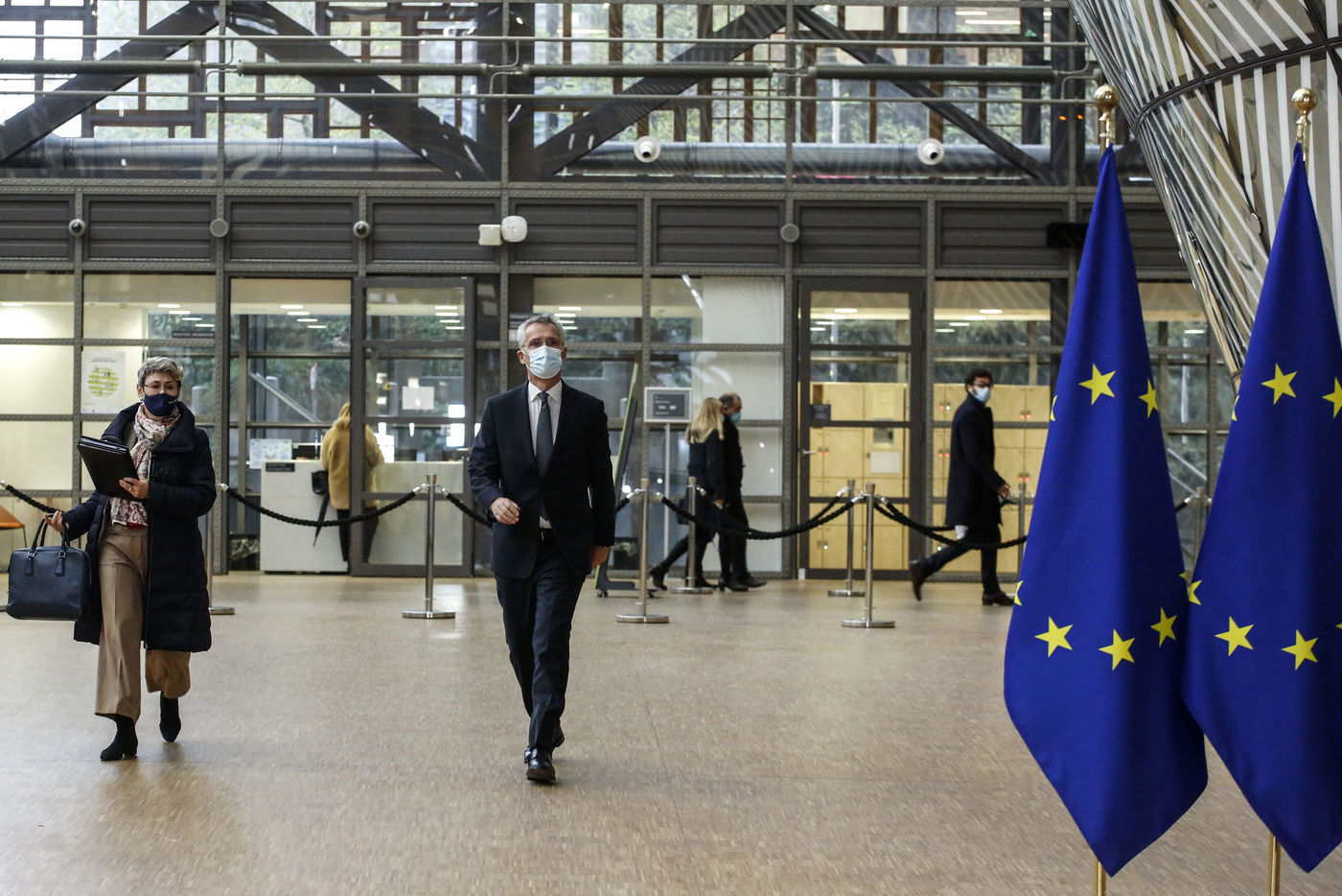 NATO Secretary General Jens Stoltenberg delivers a press statement before joining European Union Defense Ministers during the Foreign Affairs (Defense) Council at the European Council in Brussels, Belgium, November 16, 2021. Stoltenberg and ministers discussed topics relating to Belarus, Ukraine, Russia, and NATO-EU cooperation.