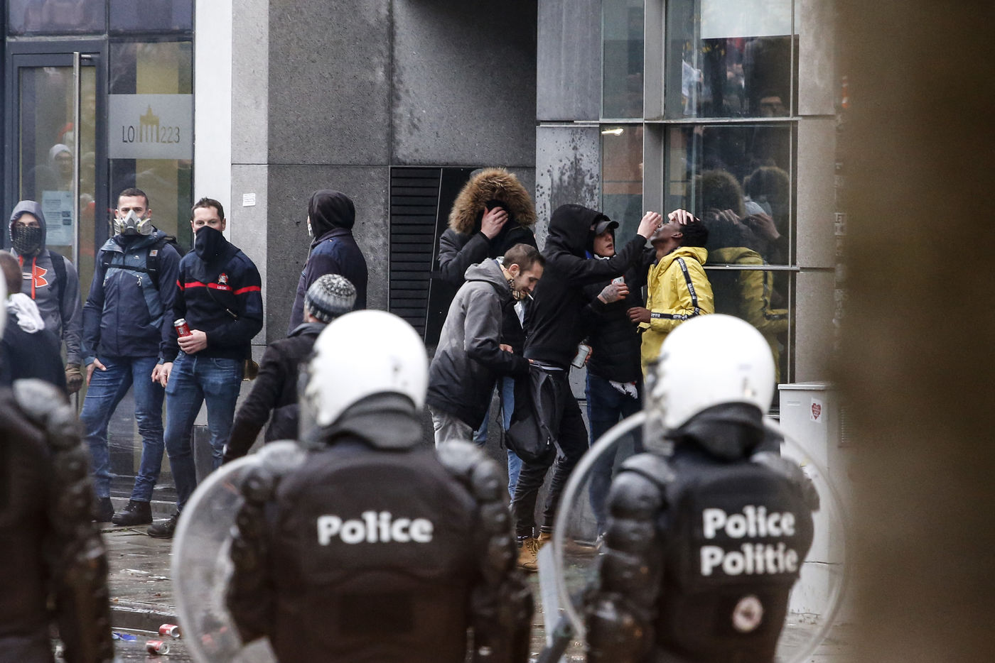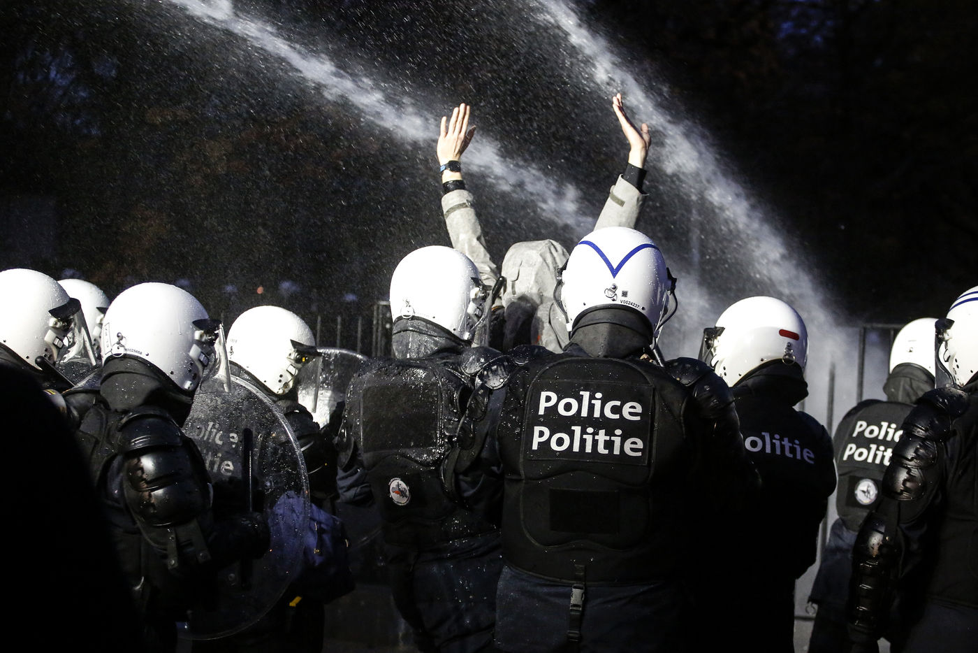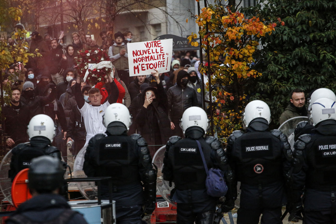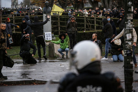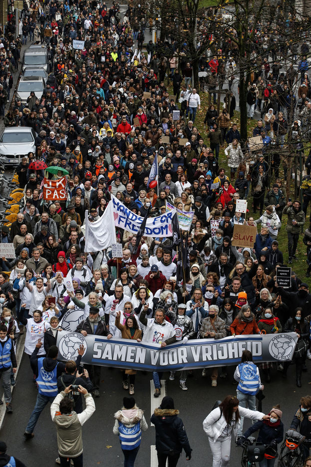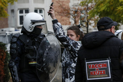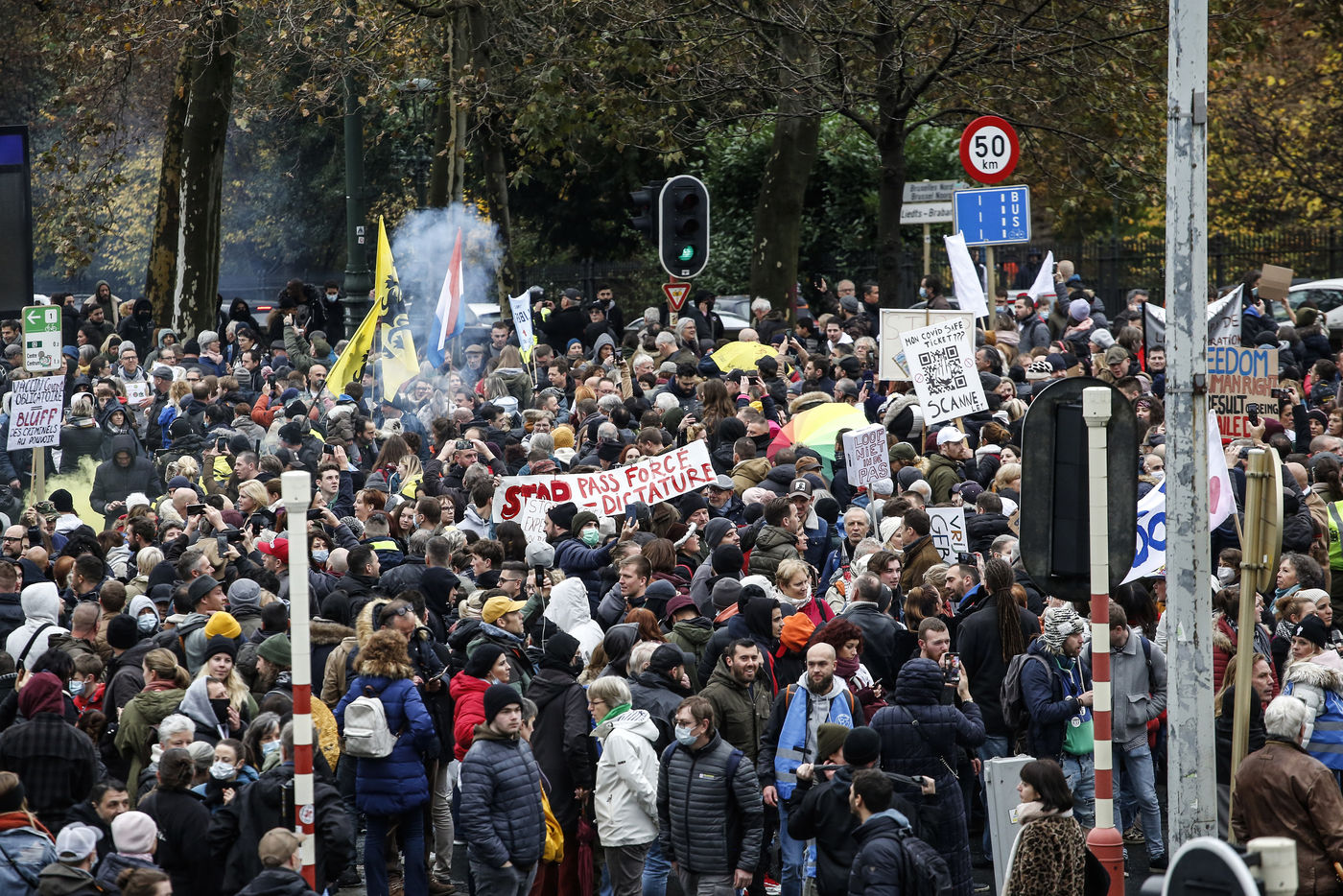 Thousands of people demonstrate against the mandatory Covid safe ticket and other anti-Covid-19 measures in Brussels, Belgium on November 21, 2021. Protesters clashed with the police. 44 protesters have been arrested and three police officers have been injured.