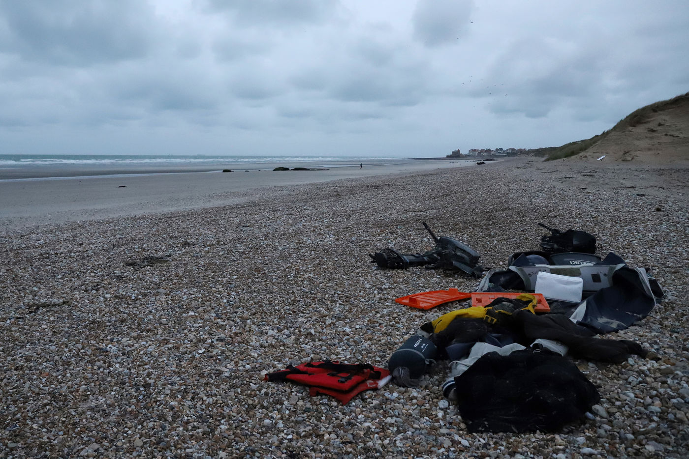 Life jackets, personal items, and a damaged inflatable boat are what remains of the passage of migrants trying to cross the Channel from Wimereux beach, near Dunkirk and Calais, in northern France. Wimereux, France, November 26, 2021. On November 24, 2021, 27 migrants died when their small boat sank while attempting to cross the Channel. The area is a natural reserve, and the absence of a politics of safe transit for migrants also creates issues at the environmental level.