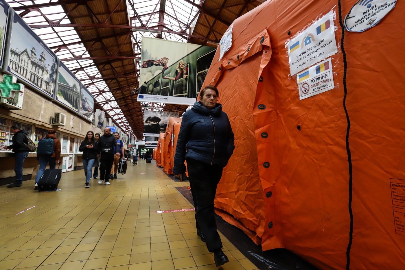 Bucharest, Romania, 2022/04/21. Displaced Ukrainians in waiting rooms at Bucharest train station. More than 690,000 Ukrainian refugees have fled to Romania so far and the country is preparing for more to come.