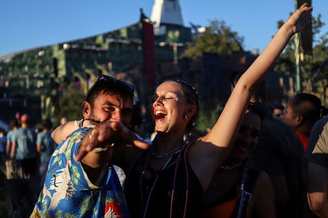 Belgique, Boom, 2022/07/15. Des visiteurs assistent au premier jour du festival de musique Tomorrowland. Il s'agit de la première édition du festival après une pause de deux ans due à la pandémie de Covid-19.