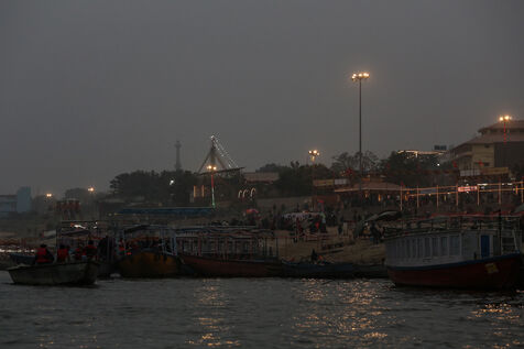 India, Varanasi, 2023/01/04. Hindu faithful take part in the Ganga Aarti ceremony at Dashashwamedh Ghat on the Ganges river.