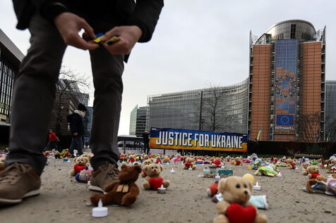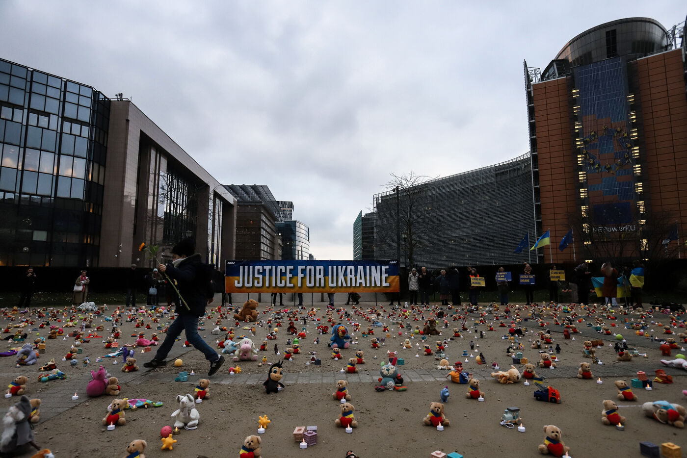 Belgium, Brussels, 2023/02/23. Demonstration organized by the NGO Avaaz near the European institutions on the occasion of the first anniversary of the Russian invasion of Ukraine. The demonstration is meant to bring to attention the reported claim of abduction of Ukrainian children by Russia.
