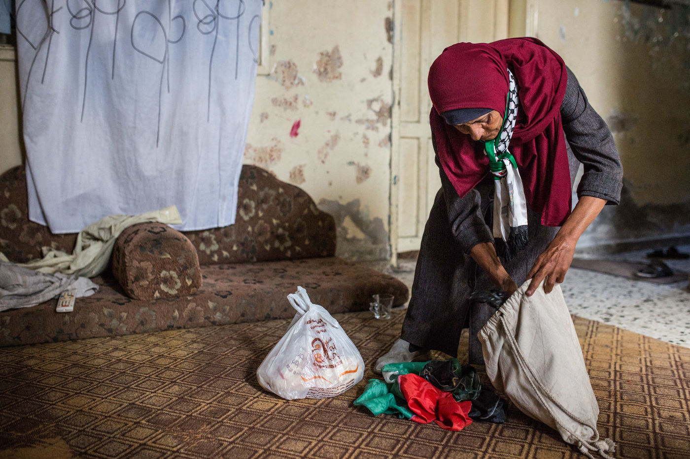 ) de 8h à 20h. Ici, je fais de mon mieux pour prendre soin et aider les Shebab (jeunes hommes) dans leurs différentes activités pour atteindre la barrière entre Israel et Gaza. Ils ont besoin d'une femme pour les protéger des soldats israéliens », explique Oum Wissam. Les shebab sont le groupe de jeunes hommes qui tentent d'atteindre et de franchir la barrière entre Israël et Gaza, un geste symbolique pour leurs droits de retour sur leur terre. Mais pas sans risques; Le 14 mai, des soldats israéliens ont tué au moins 52 Palestiniens et en ont blessé plus d'un millier, les manifestations coïncidaient avec l'ouverture controversée de l'ambassade des États-Unis à Jérusalem. Considérée comme «la mère du camp de Malaka», Oum Wissam prend soin de tous les Shebab en préparant le thé, en trouvant de la nourriture mais aussi en prenant part aux actions telles que trouver et brûler des pneus pendant les manifestations du vendredi. "J