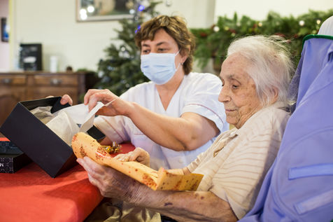 Christmas celebrations at the EHPAD de Saint-Sulpice in Villerest (France) in the midst of the health crisis at Covid-19. Despite the strict health constraints, the staff organise themselves to celebrate the end-of-year festivities with the residents. As a gesture of solidarity, pupils and parents from a neighbouring secondary school prepared gifts for the elderly.