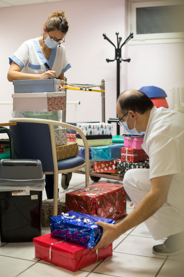 Fêtes de Noël à l'EHPAD de Saint-Sulpice à Villerest (Loire, 42) en pleine crise sanitaire de la Covid-19. Malgré les contraintes sanitaires strictes, le personnel s'organise pour célébrer les fêtes de fin d'année avec les résidents. Par solidarité, les élèves et les parents d'un collège voisin ont préparé des cadeaux pour les personnes âgées.
