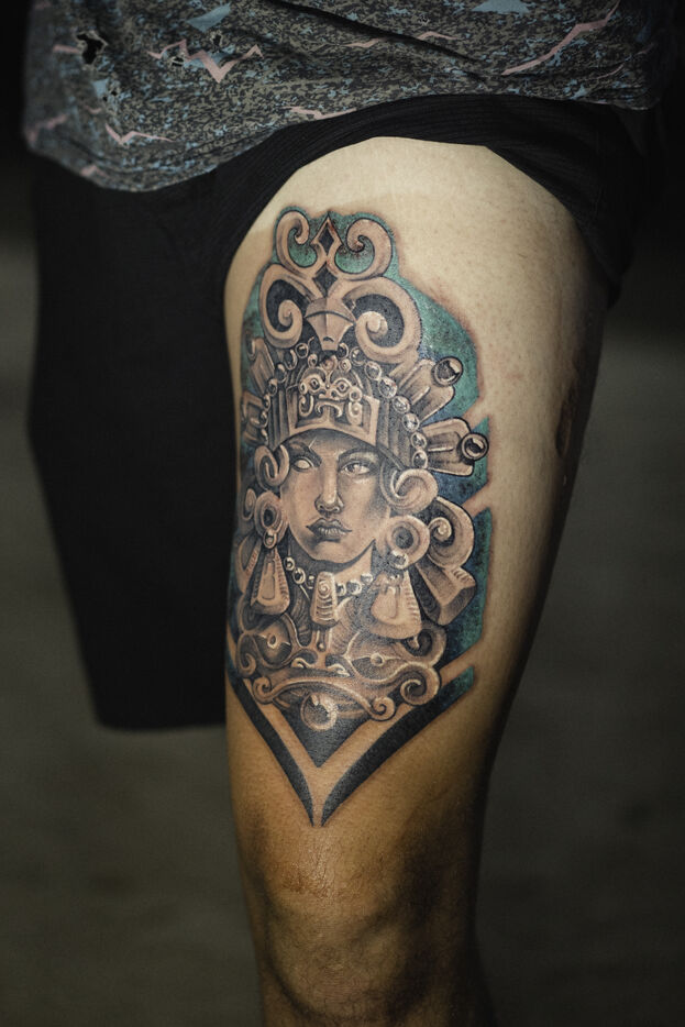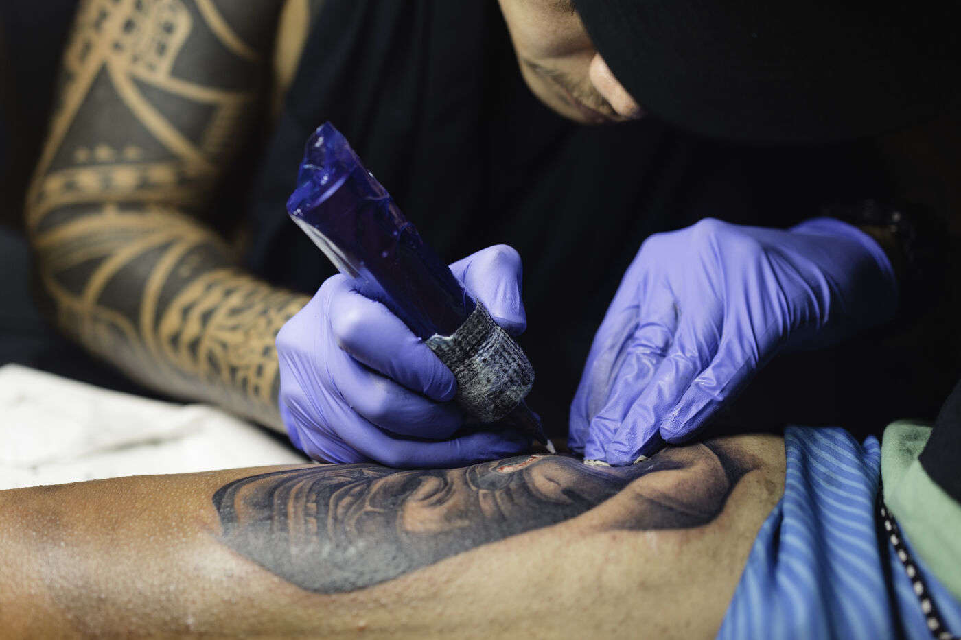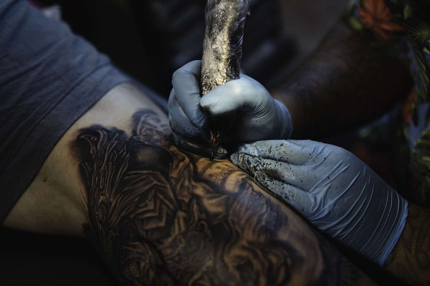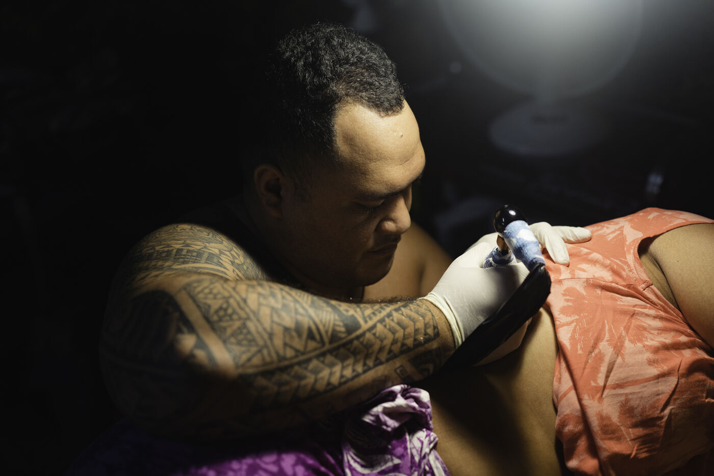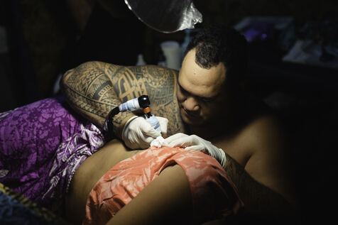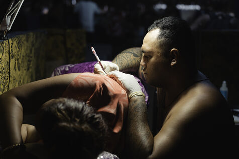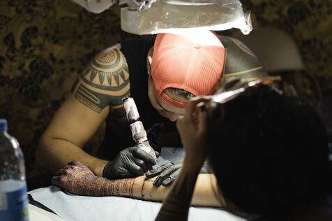 Faa'a nui a tu te tatau is an annual tattoo festival that takes place at the town hall of Faa'a, the most populated commune in Tahiti. This festival aims to highlight young tattoo artists. On the last day of this 2023 edition, they competed on the theme of custom, a rather free theme allowing to link traditional Polynesian tattooing to various inspirations. The tattooed people are called "support", the one that allows the tattoo artist to express himself. The function surpassing the humanity of the person, their face become secondary.