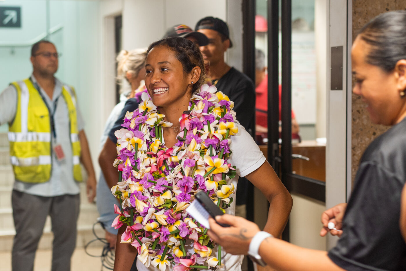 The two Tahitian surfers Vahine Fierro and Kauli Vaast, French team coach for Paris 2024 Hira Teriinatoofa, and manager Hugo Palmarini from the French Surfing Federation, were welcomed at Tahiti Faa'a International Airport. The two athletes qualified a few days ago to represent France in the surfing event at the Paris 2024 Olympic Games following the ISA Worlds in El Salvador.