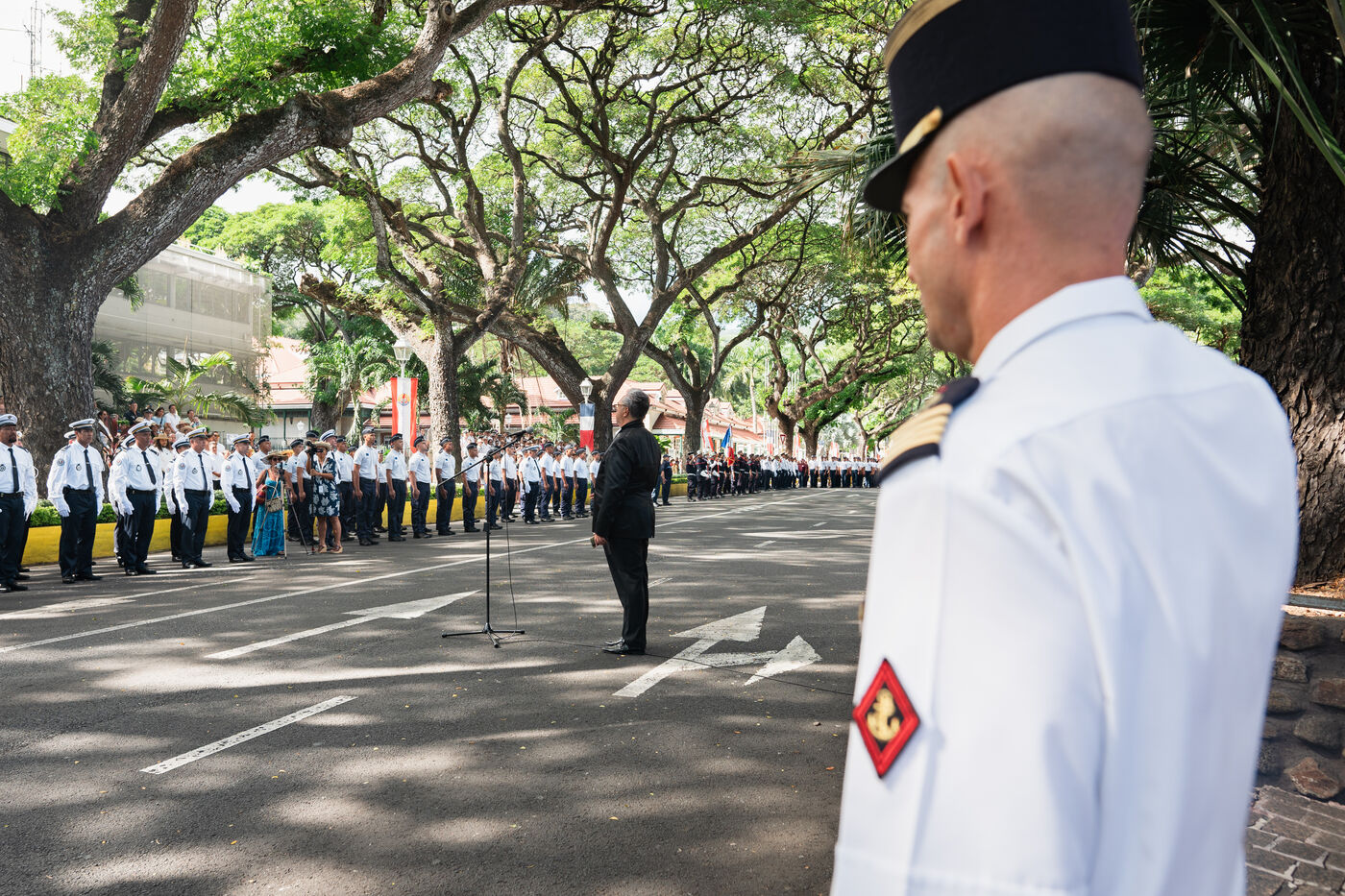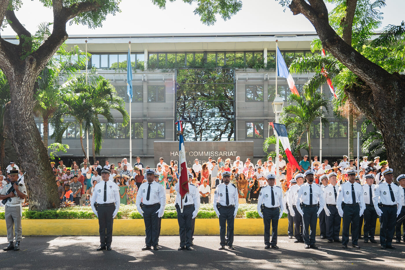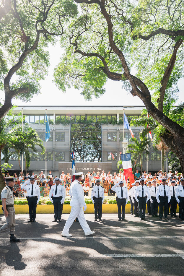 French Polynesia, 2023-07-14. The July 14th parade took place on avenue Pouvanaa in Oopa, between the French High Commission in French Polynesia and the Monument aux morts. The French armed forces present in the territory and a delegation from the Peruvian navy, on a stopover in Papeete, paraded in front of the officials present: High Commissioner Eric Spitz, President of French Polynesia Moetai Brotherson, President of the Assembly of French Polynesia Antony Geros, deputies to the National Assembly Steve Chailloux, Tematai Le Gayic and Mereana Reid Arbelot, and CESEC representatives Tu Yan and Eugene Sommers. The image shows officers of the Direction territoriale de la police nationale standing motionless in front of the High Commission building. Photograph by Vaikehu Shan / Hans Lucas.