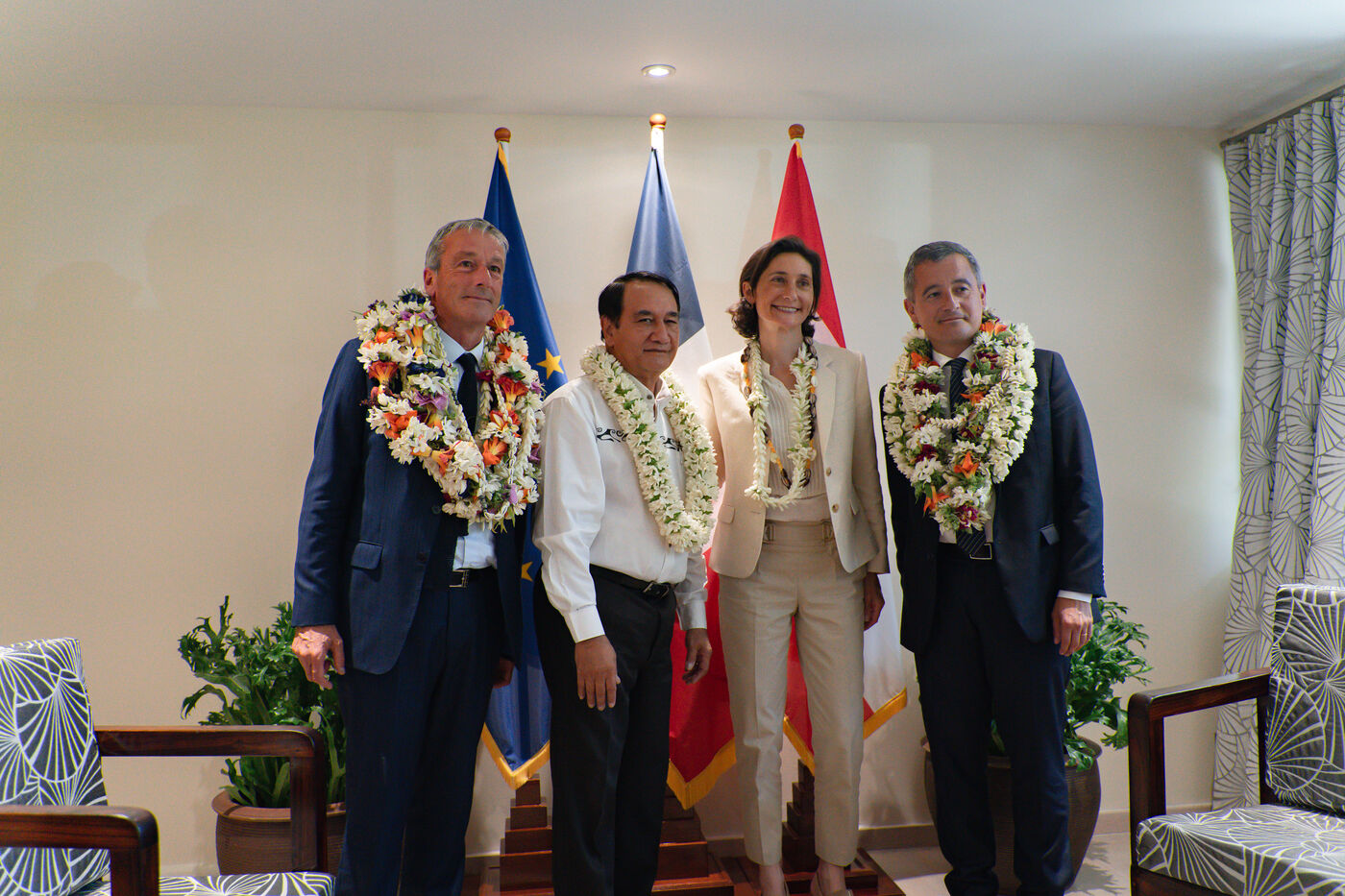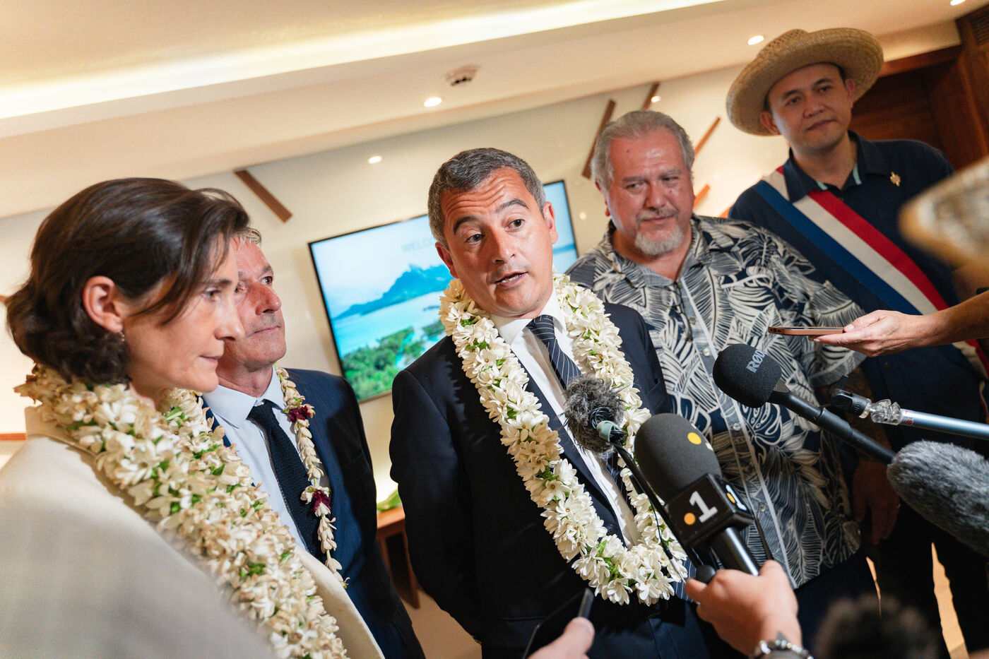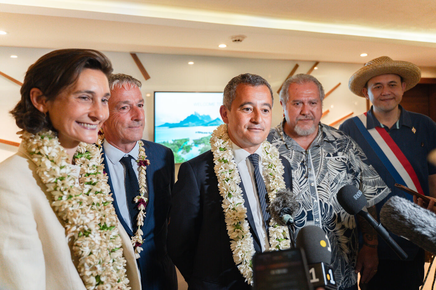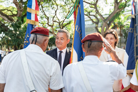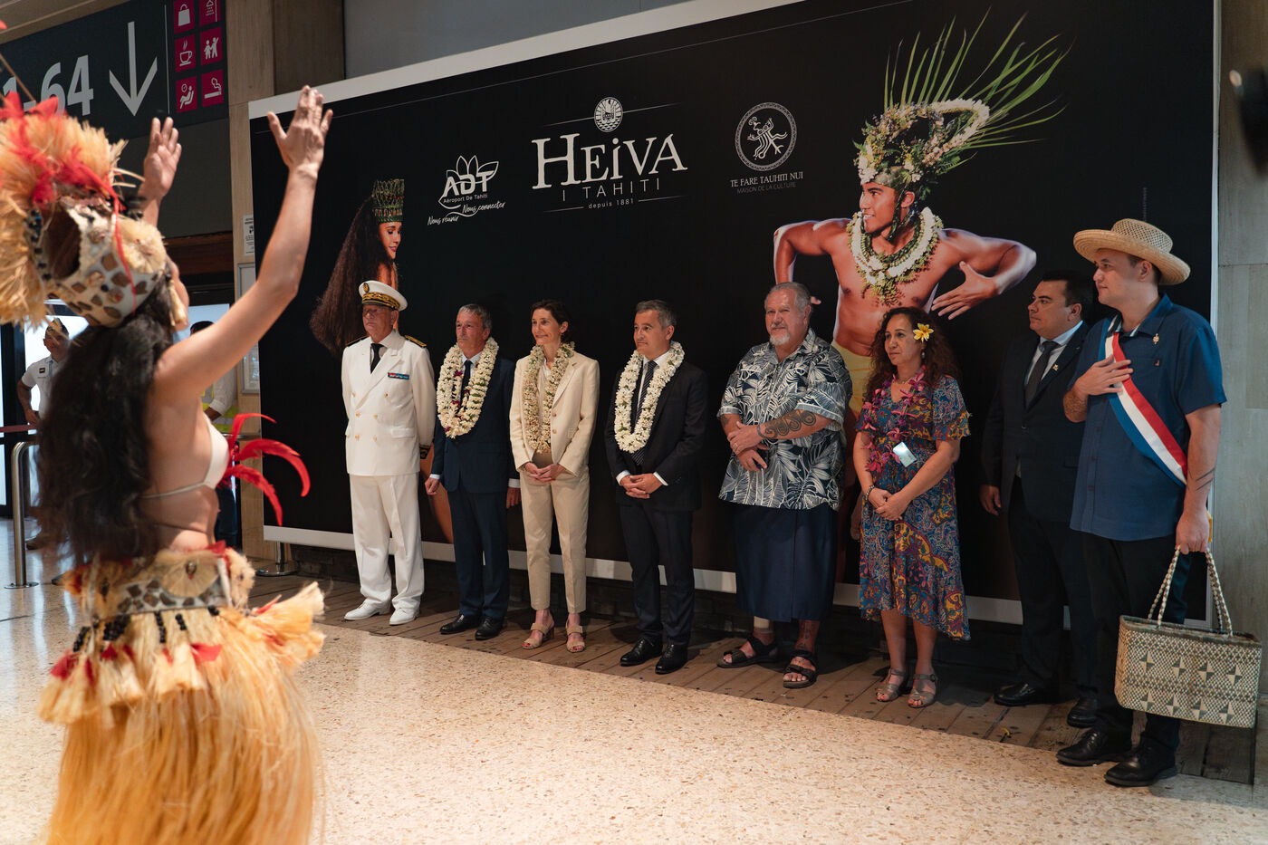 Déplacement en Polynésie française du ministre de l'Interieur et des Outre-mer Gérald Darmanin, de la Ministre des Sports et des Jeux Olympiques et Paralympiques Amélie Oudea-Castera, et du Ministre délégué chargé des Outre-mer Philippe Vigier. A leur arrivée à l'aéroport international de Tahiti-Faa'a, ils ont été accueilli comme le veut la tradition par un groupe de danse tahitienne, avant de se rendre à Papeete pour un dépôt de gerbe au monument aux morts et une visite de courtoisie à Moetai Brotherson, Président de la Polynésie française, et à Antony Géros président de l'Assemblée de la Polynésie française.