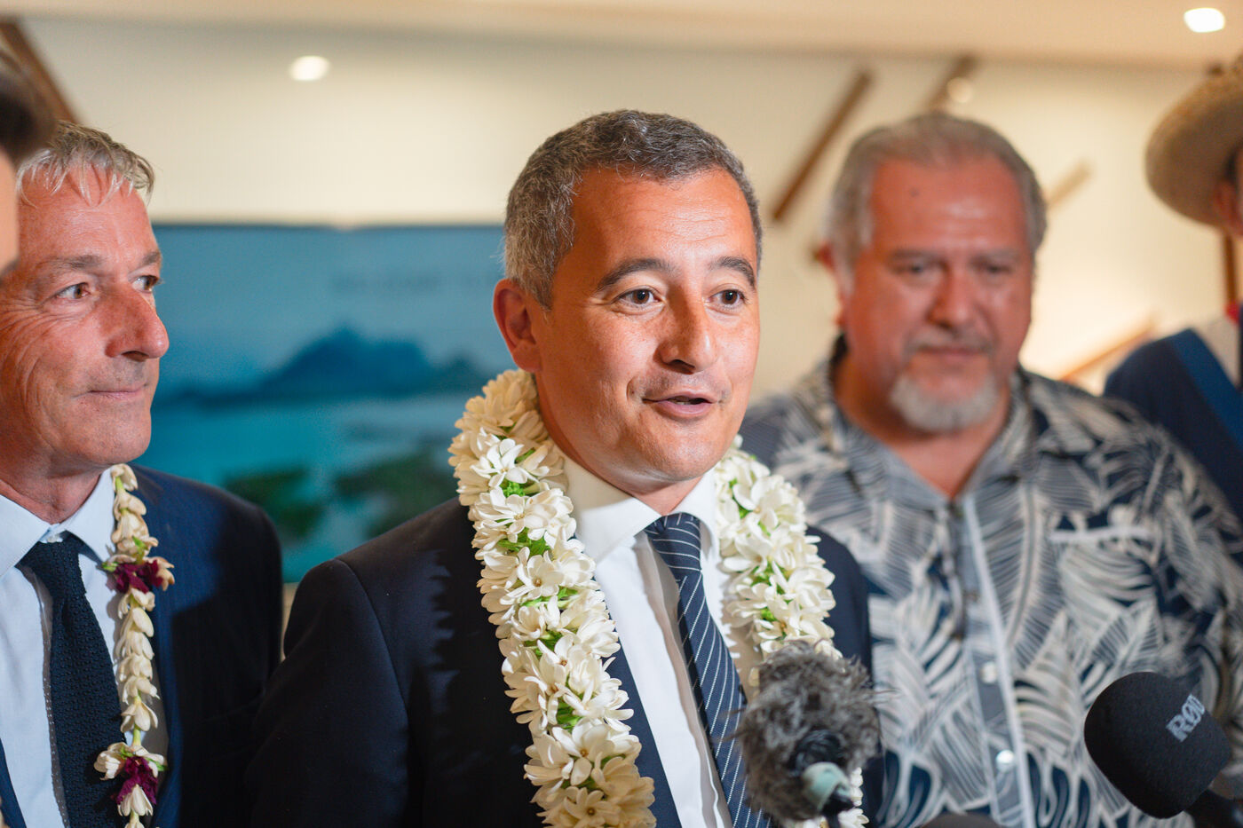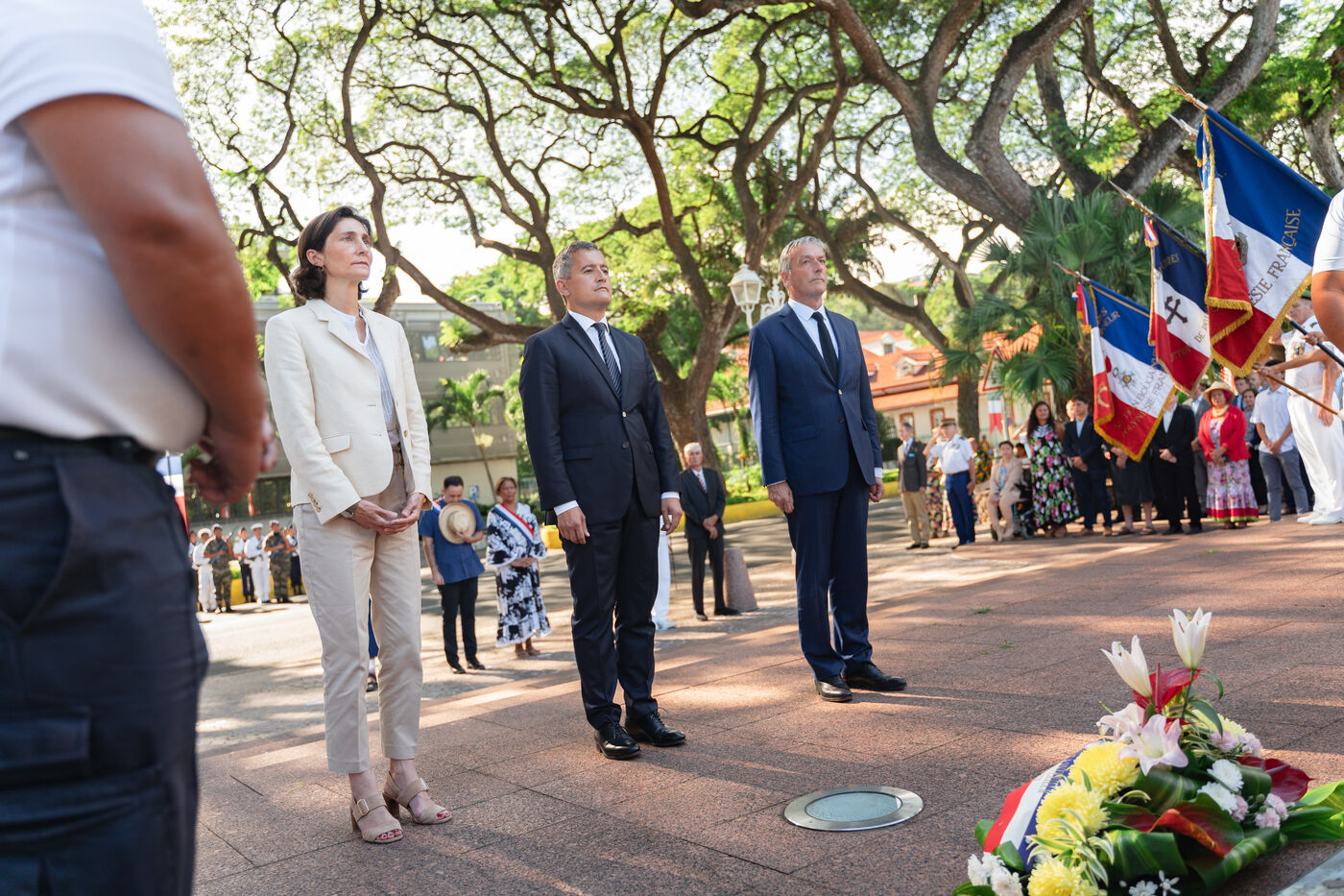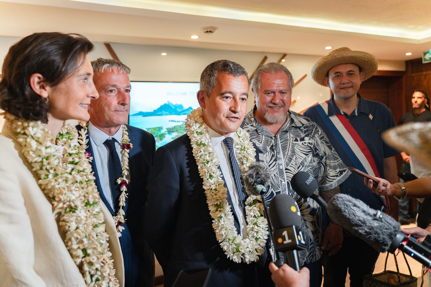 Déplacement en Polynésie française du ministre de l'Interieur et des Outre-mer Gérald Darmanin, de la Ministre des Sports et des Jeux Olympiques et Paralympiques Amélie Oudea-Castera, et du Ministre délégué chargé des Outre-mer Philippe Vigier. A leur arrivée à l'aéroport international de Tahiti-Faa'a, ils ont été accueilli comme le veut la tradition par un groupe de danse tahitienne, avant de se rendre à Papeete pour un dépôt de gerbe au monument aux morts et une visite de courtoisie à Moetai Brotherson, Président de la Polynésie française, et à Antony Géros président de l'Assemblée de la Polynésie française.