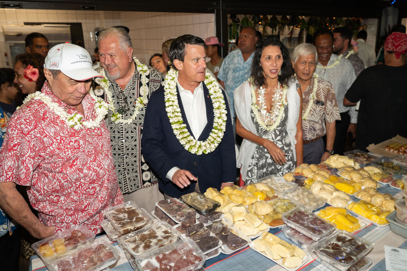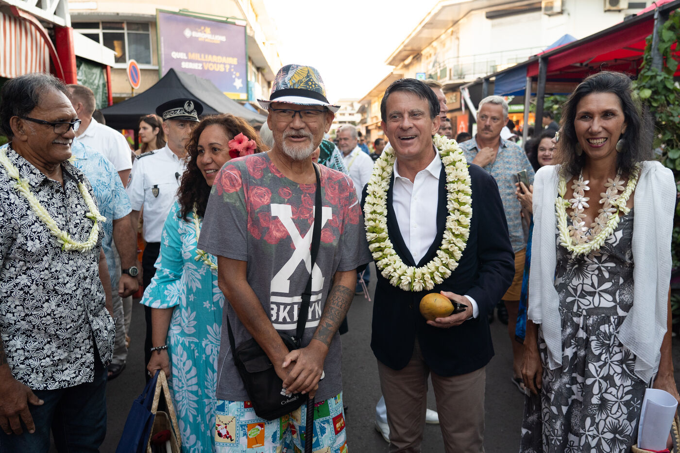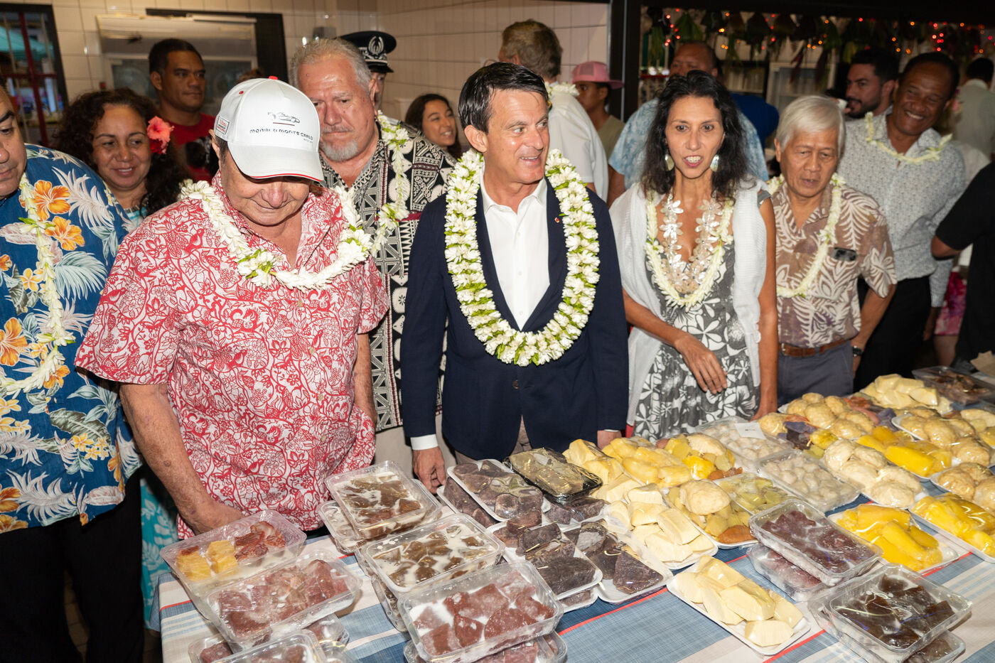 Manuel Valls, the French Minister of the Overseas Territories, visits the city market of Papeete on a Sunday morning and its exhibitors of fruits, vegetables, fish, craftsmen.