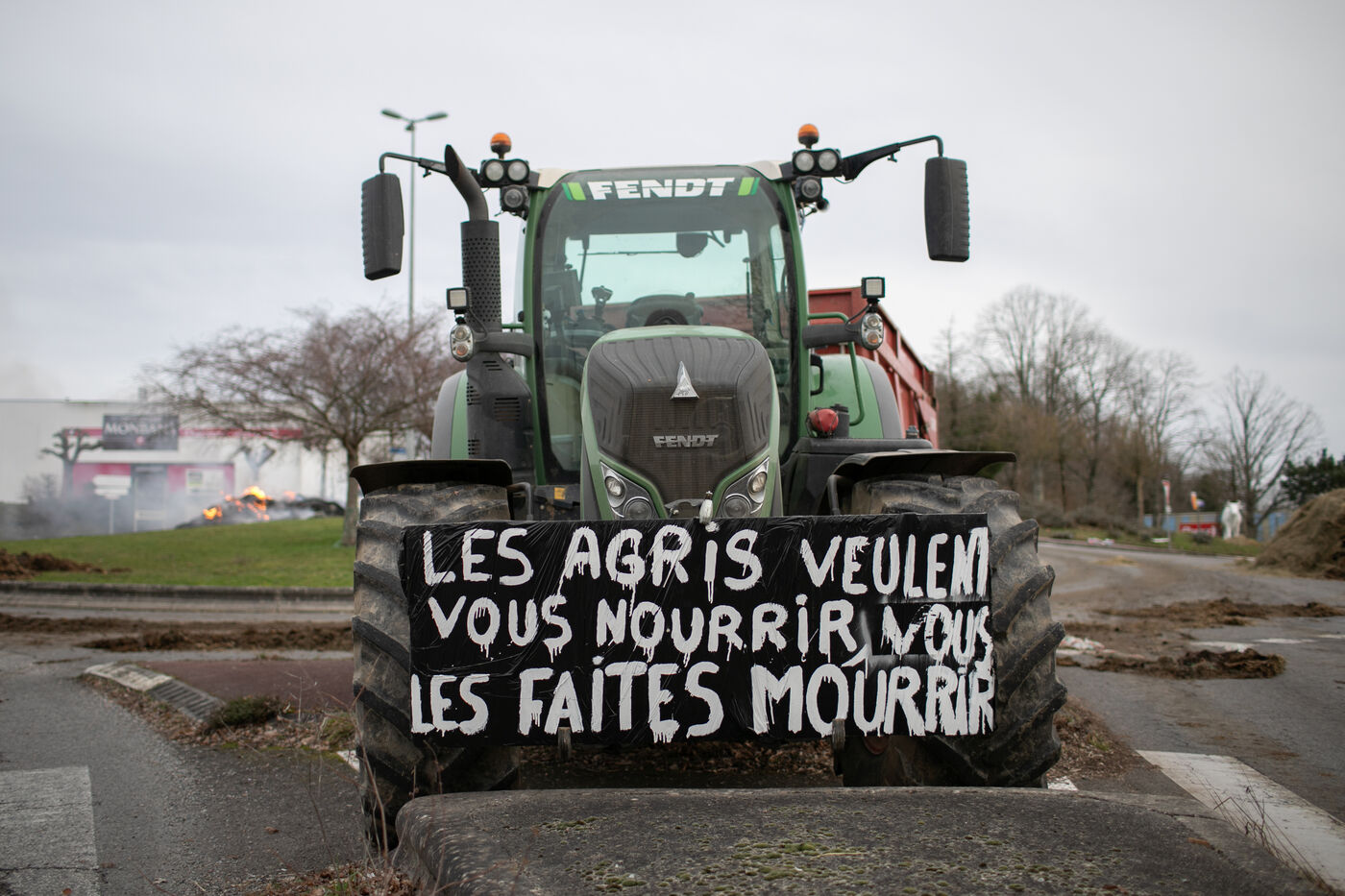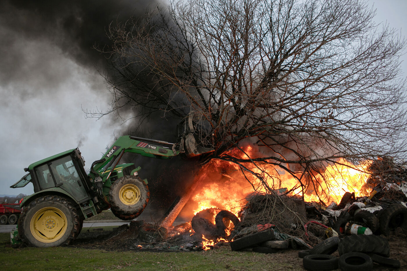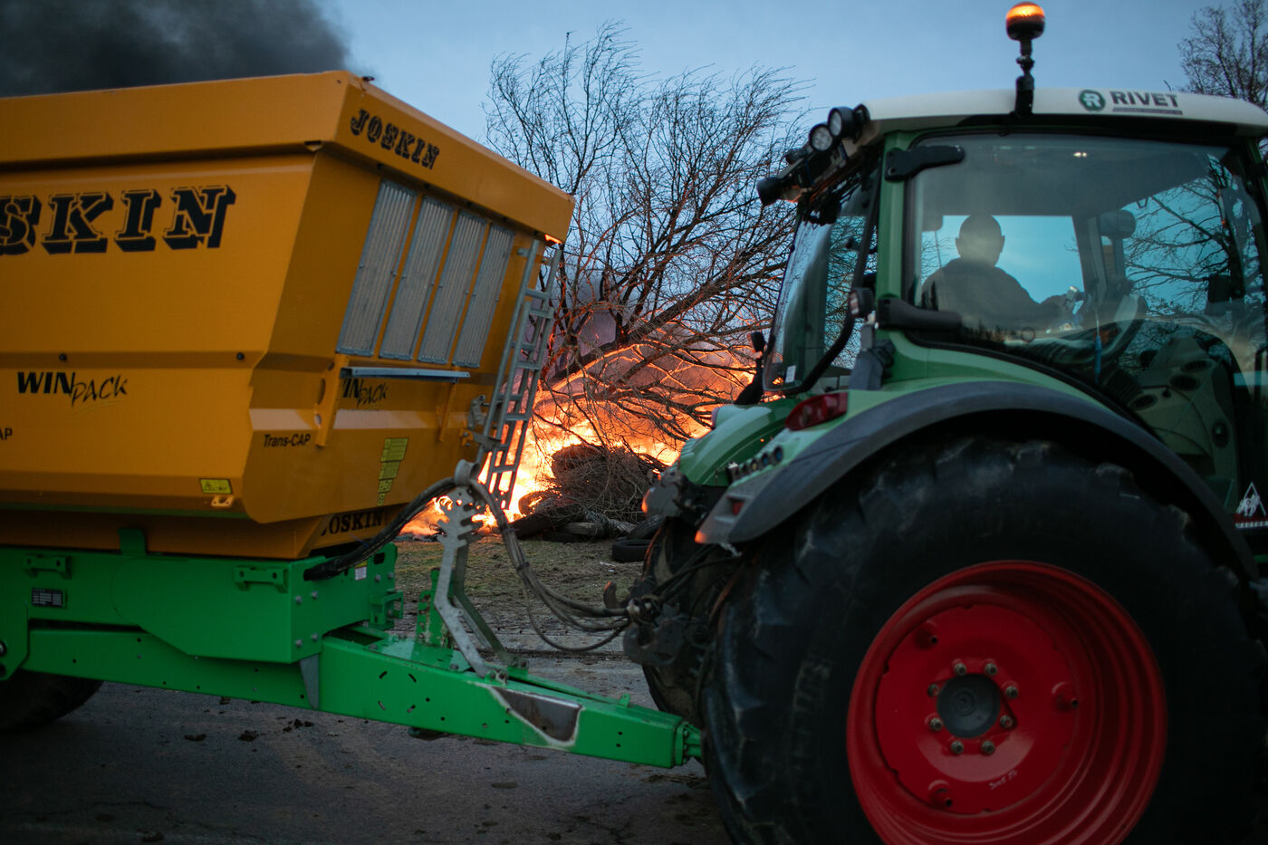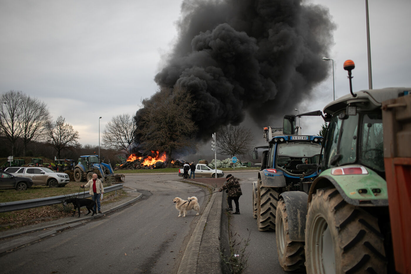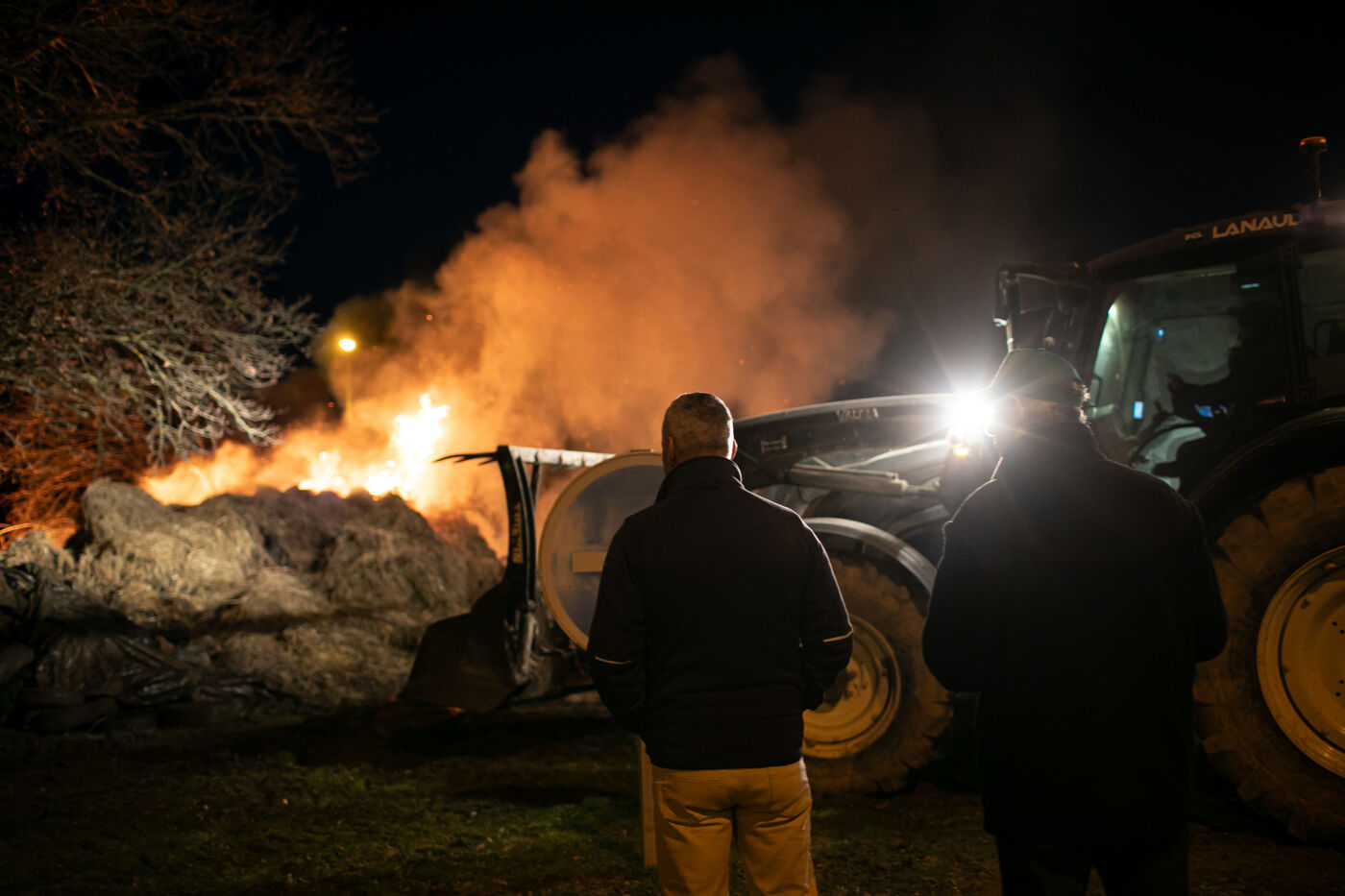 FRANCE, Limoges January 29, 2024, Blockade of the A20 at Boisseuil in Limoges' southern commercial zone. The FNSEA and Jeunes Agriculteurs unions called for a siege of Paris and a blockade of the main freeways from 2pm this Monday, after failing to get a satisfactory response from the government's announcements, for all farmers' unions. In particular, they are calling for a simplification of environmental standards, better remuneration and the introduction of levers to compensate for the taxation of non-road diesel fuel. Photography for Victoria Valdivia Trigo / Hans Lucas.