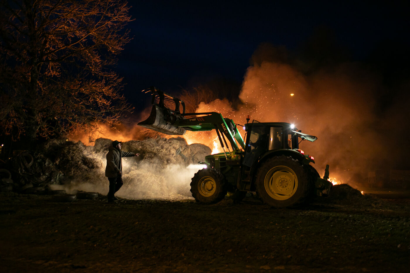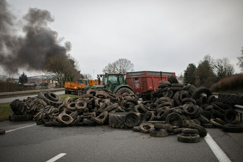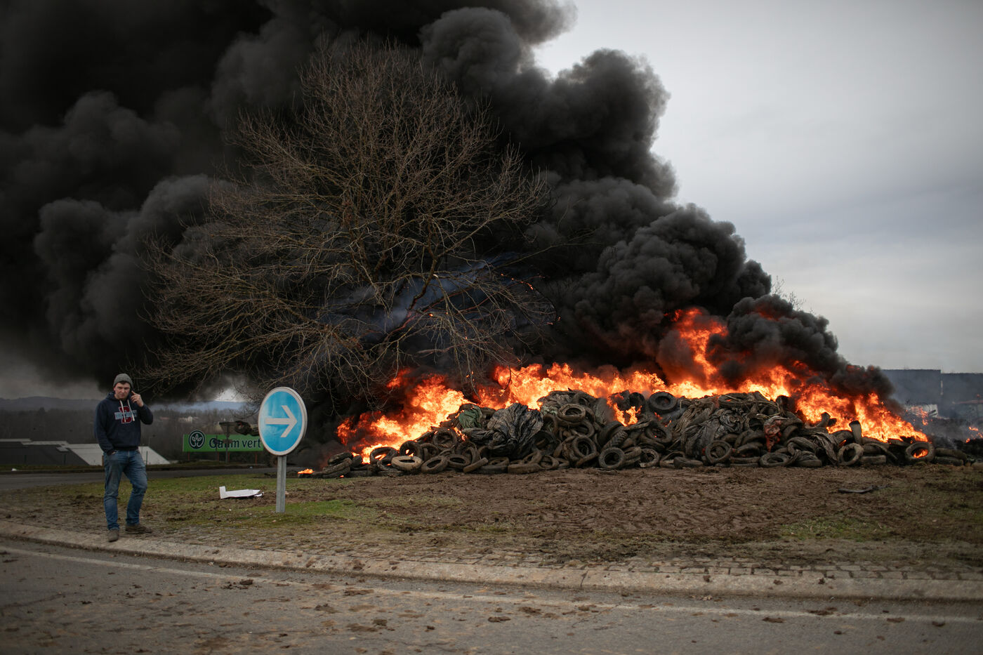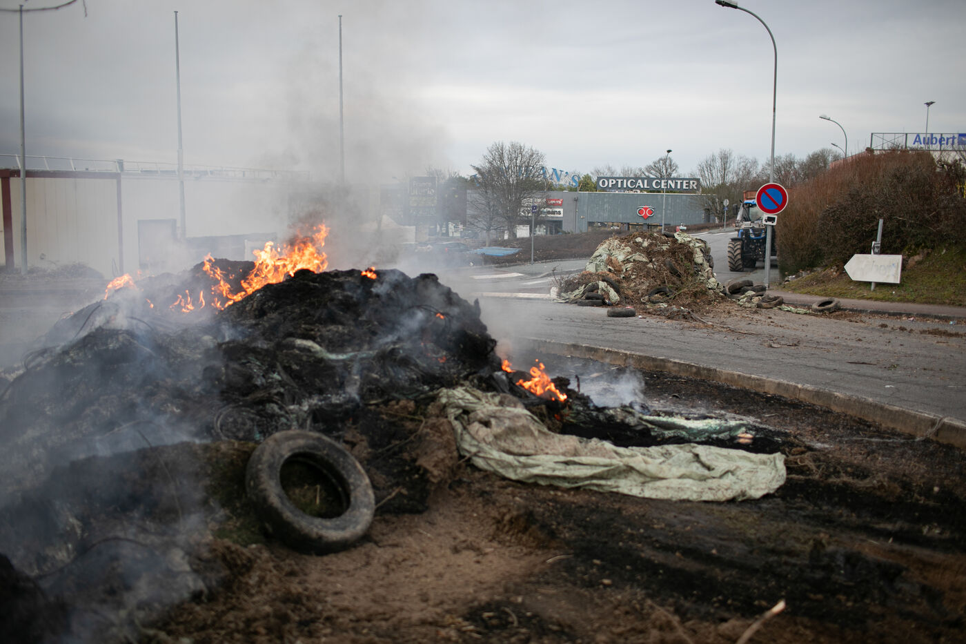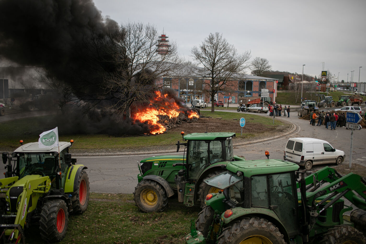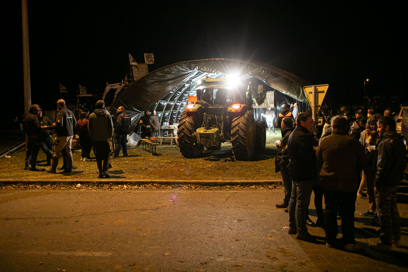 FRANCE, Limoges January 29, 2024, Blockade of the A20 at Boisseuil in Limoges' southern commercial zone. The FNSEA and Jeunes Agriculteurs unions called for a siege of Paris and a blockade of the main freeways from 2pm this Monday, after failing to get a satisfactory response from the government's announcements, for all farmers' unions. In particular, they are calling for a simplification of environmental standards, better remuneration and the introduction of levers to compensate for the taxation of non-road diesel fuel. Photography for Victoria Valdivia Trigo / Hans Lucas.
