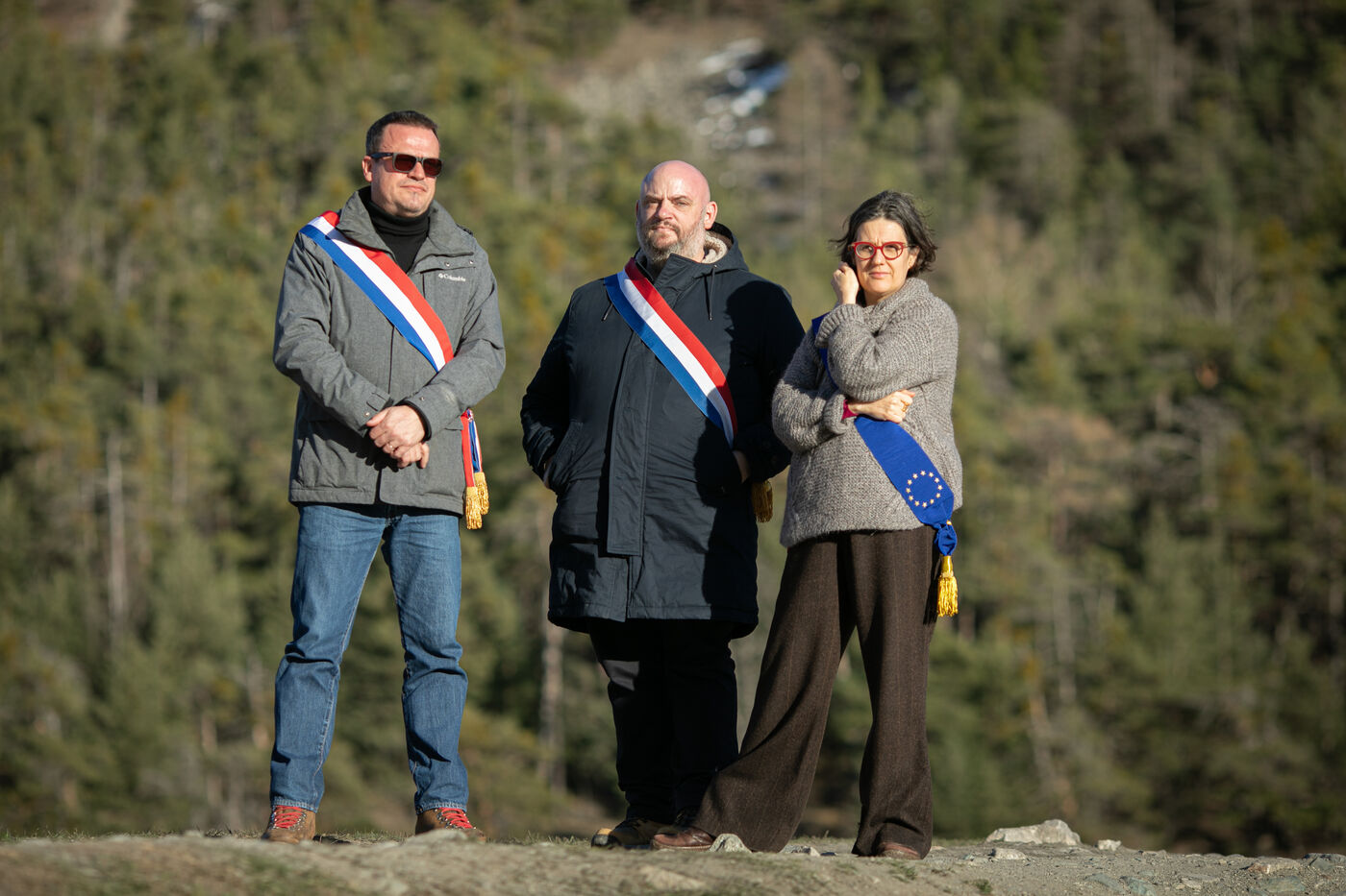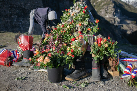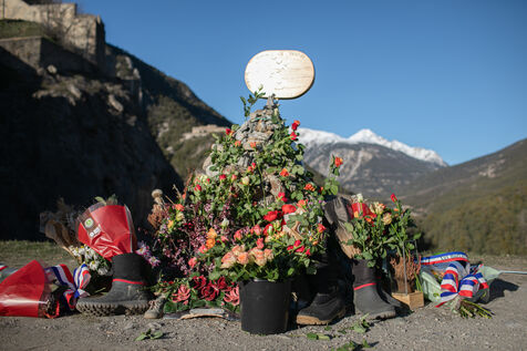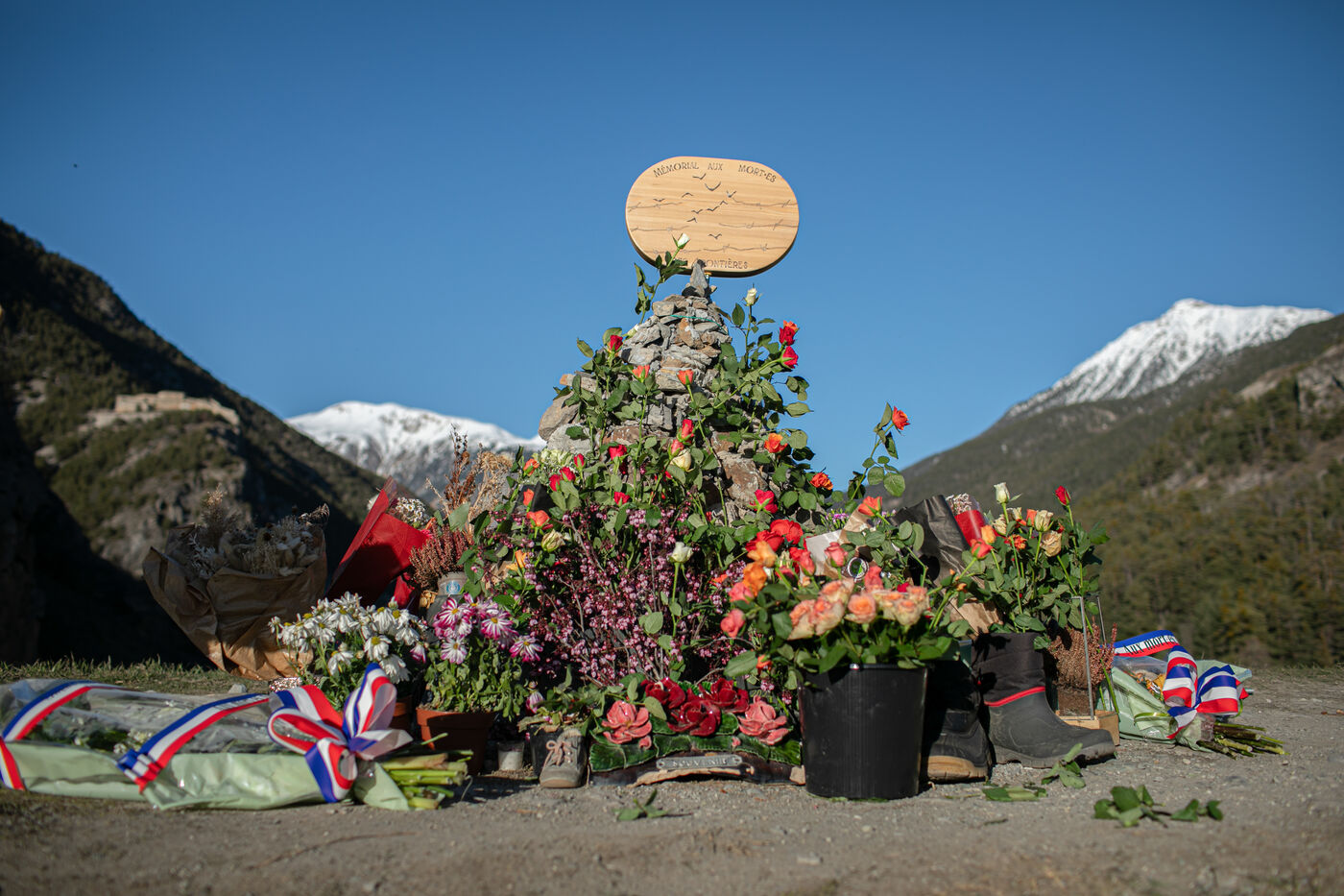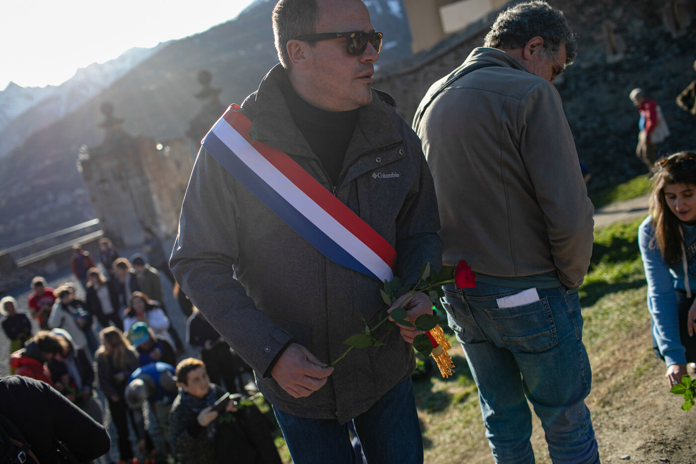 FRANCE, Briançon 16 mars 2024, rassemblement autour du memorial aux morts des frontières situe dans le fort de Briançon, en présence des associations, militants et des élus pour déposer des fleurs aux pieds du cairn. Photographie par Victoria Valdivia Trigo / Hans Lucas.