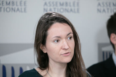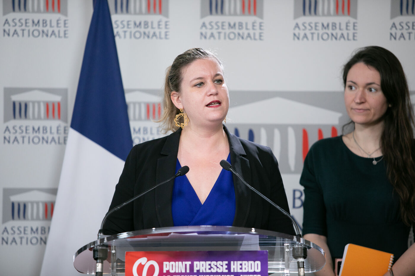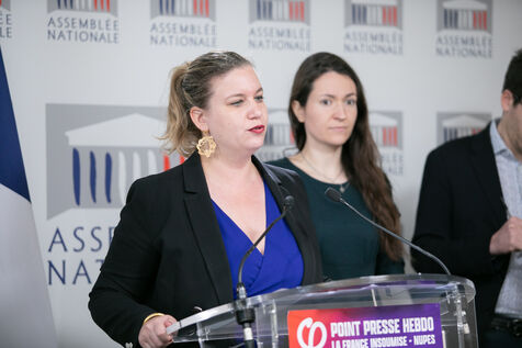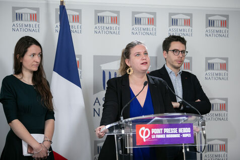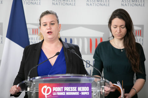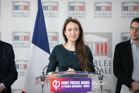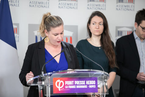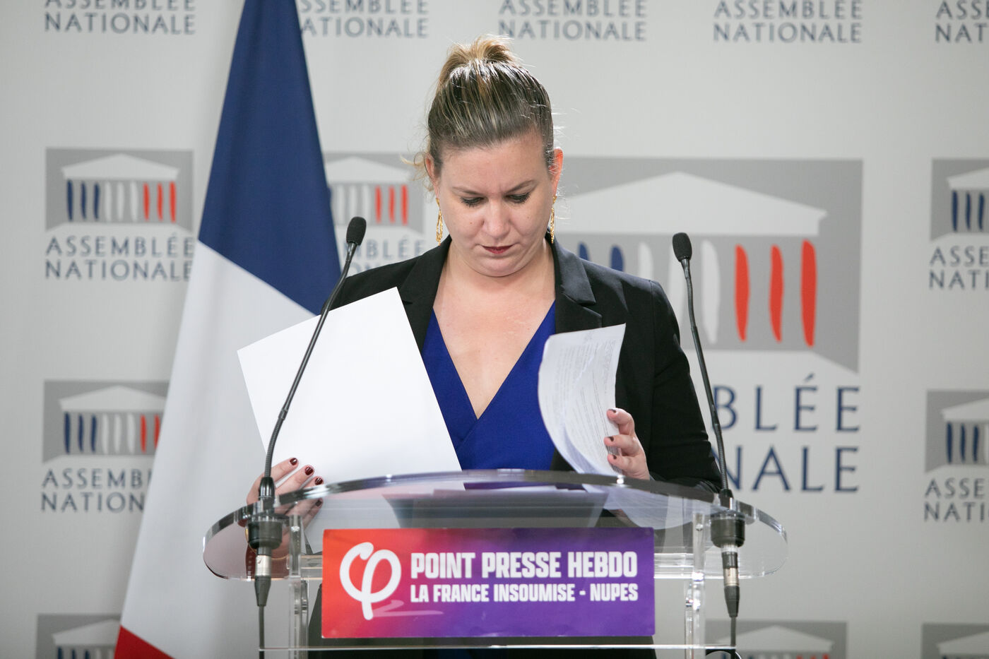 FRANCE, Paris April 09, 2024, press briefing by Mathilde Panot, Val-de-Marne, president of the La France insoumise group, Nouvelle Union Populaire écologique et sociale LFI-NUPES. Photography by Victoria Valdivia Trigo / Hans Lucas.